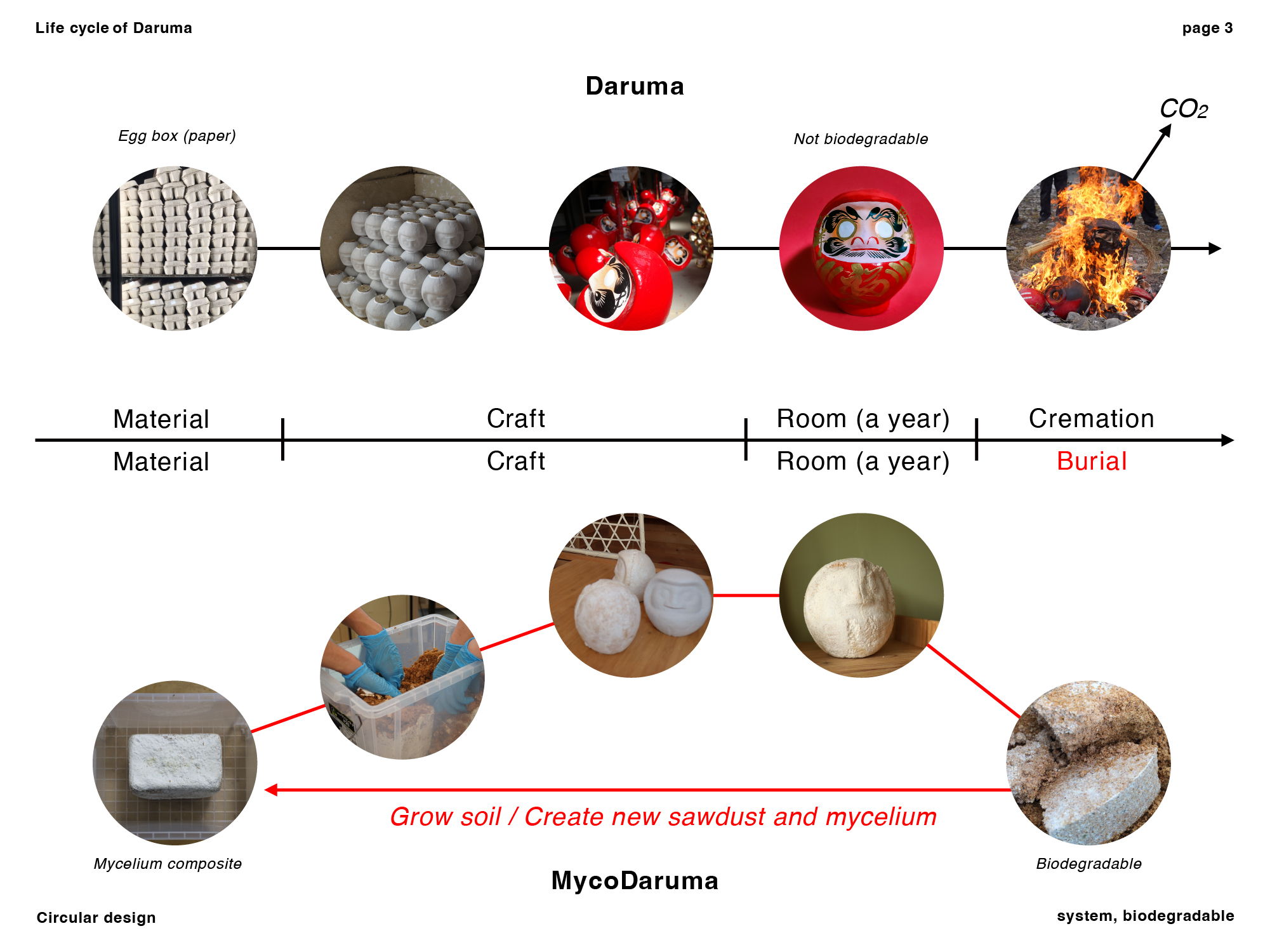 だるまは日本の縁起物であり、ご利益の期限は1年間である。そのため、一年の最後に仏閣でお焚き上げ(火葬)を行う。一方、MycoDarumaは菌糸とおがくずから形成されているため土に還る(土葬)。土や森からできたものが、一時的に人間の工芸品としての形を成し、お役目を終えると元の状態に還るようにデザインされている。自然を支配するのではなく、自然を借りる日本の自然観があらわれている。人間中心に止まらない、多元的な世界観でありマルチスピーシーズデザインを実践している。
