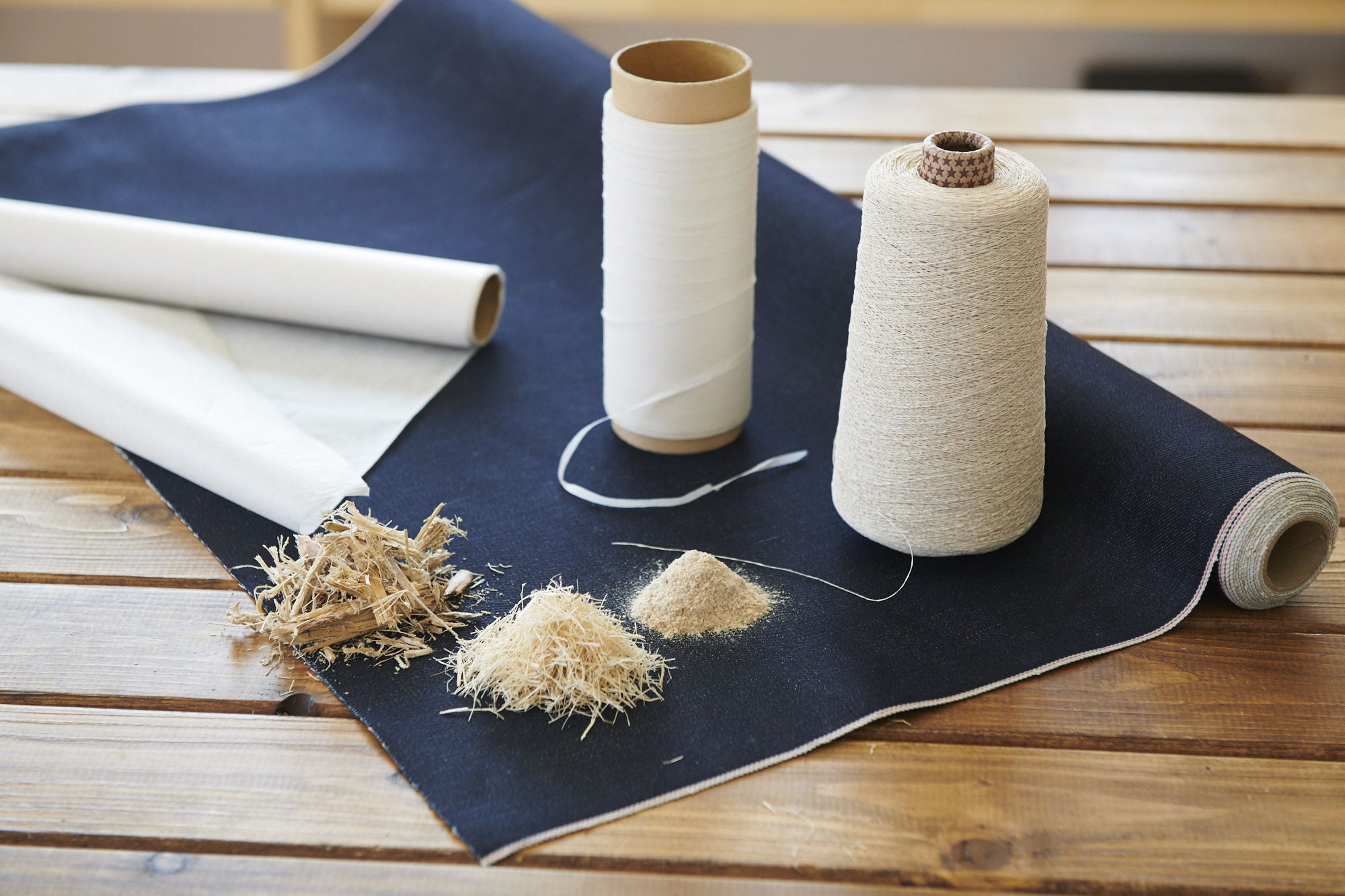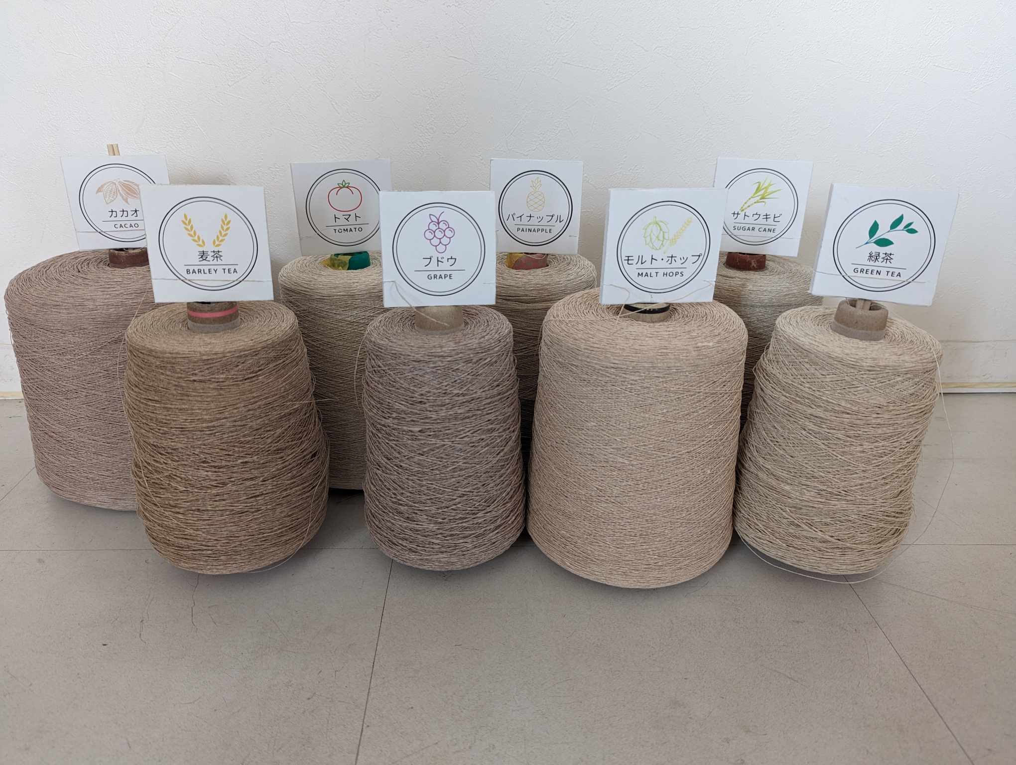 残渣を乾燥・パウダー化し、マニラ麻と混ぜて和紙を生成、その和紙を割いて撚ることで糸を生成しています。その糸で織った生地や、パウダー・紙・糸の素材を、地域の伝統産業や企業のブランドと掛け合わせ、高付加価値商品の開発を行なっています。