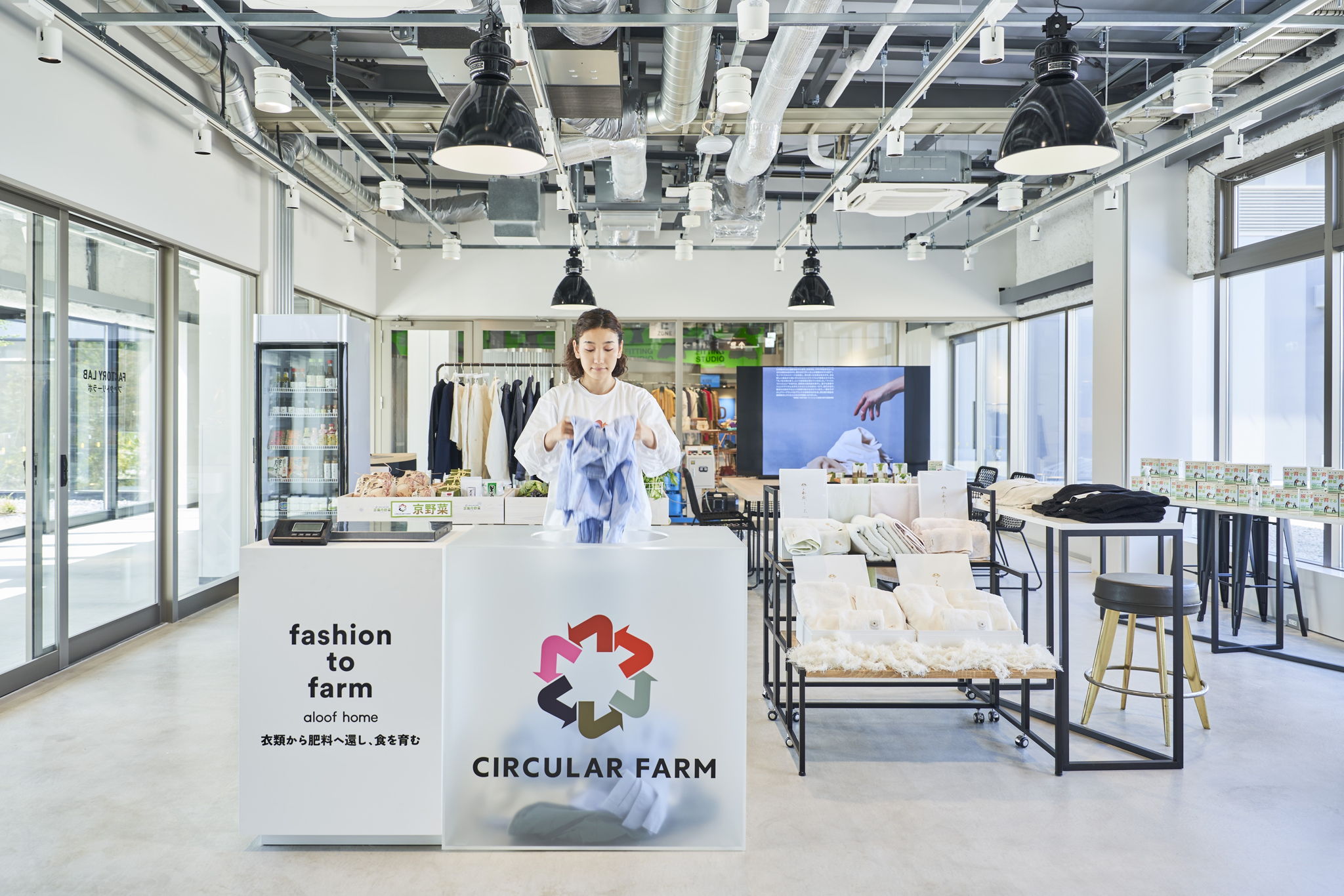 KISARAZU CONCEPT STORE (hereinafter called "KCS") is an experimental site for creating a new clothing cycle. Customers pay an admission fee of 300 yen to enter the store, where they can enjoy shopping and experience the new technology of clothing recycling.