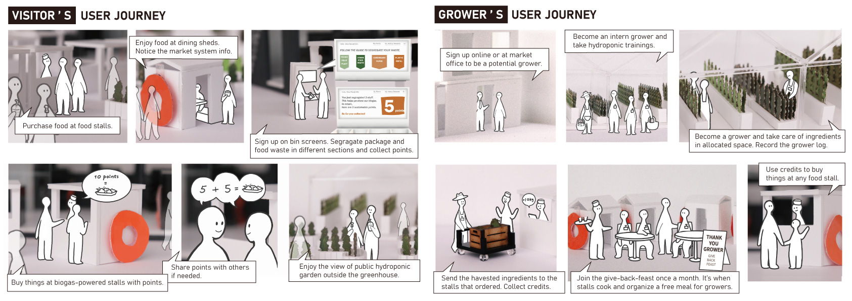 For food vendors, they receive biogas made from their customers and ingredients grown by nearby residents. For market workers, they receive help from market customers. For visitors, they benefit from biogas made by previous visitors and they can follow the steps. For growers, especially environmentalist communities and citizens who have time, growing at the market hydroponic greenhouse can endow them with the sense of engagement in sustainability and sharing.