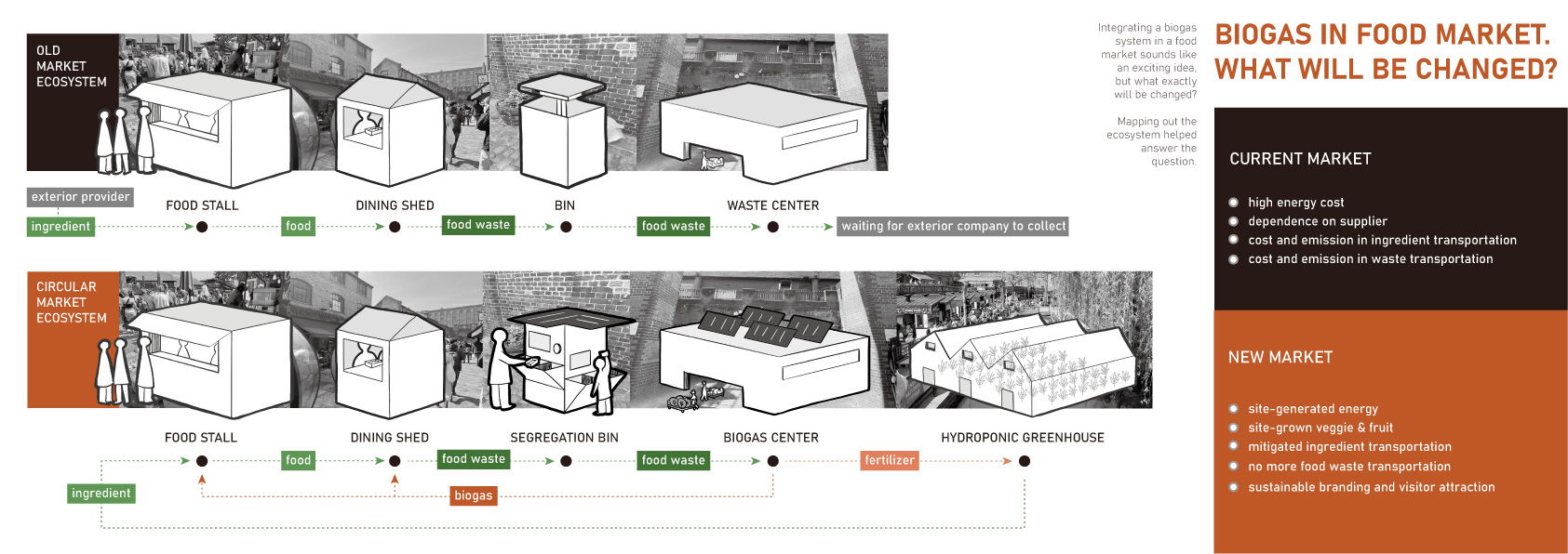 Urban food markets are popular places that are suitable as a platform to start educating people and engage them in making green energy. Currently, market food waste just waits in the bins for the twice-a-week collection, there are around 680kg of food waste produced every day. If turned into biogas on-site, they will be able to power 40 food stalls to cook for another day.