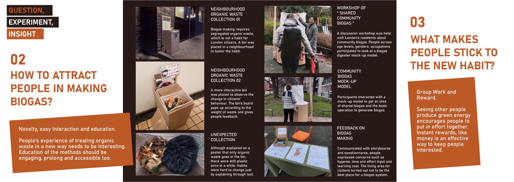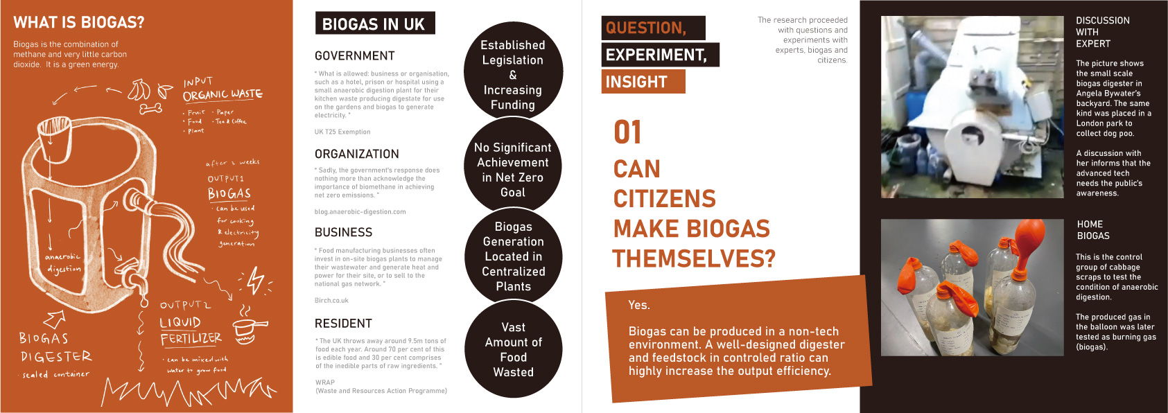 London produces nearly 2 million tonnes of food waste and releases 250,000 tonnes of unnecessary CO2 emissions every year. Sending them to biogas plants produces CO2 footprints as well. Decentralized small-scale biogas generation is a developed technology that can turn food waste into energy and a better solution. Based on experiments in a living area, London citizens are not prepared to make their biogas for households for now.