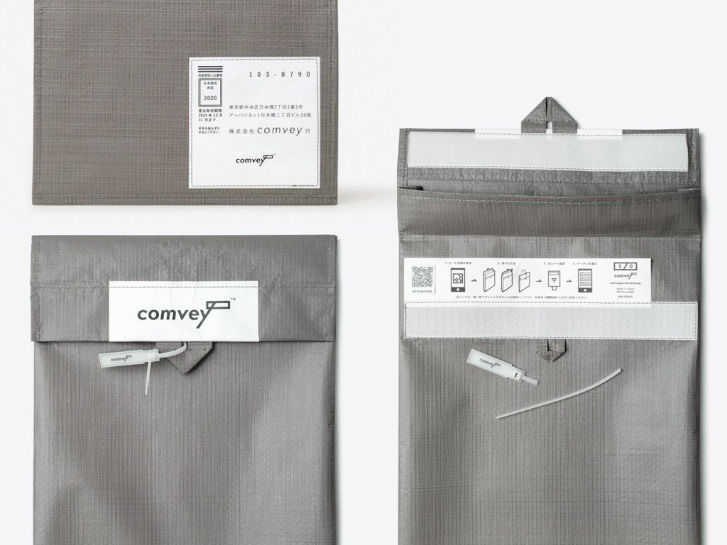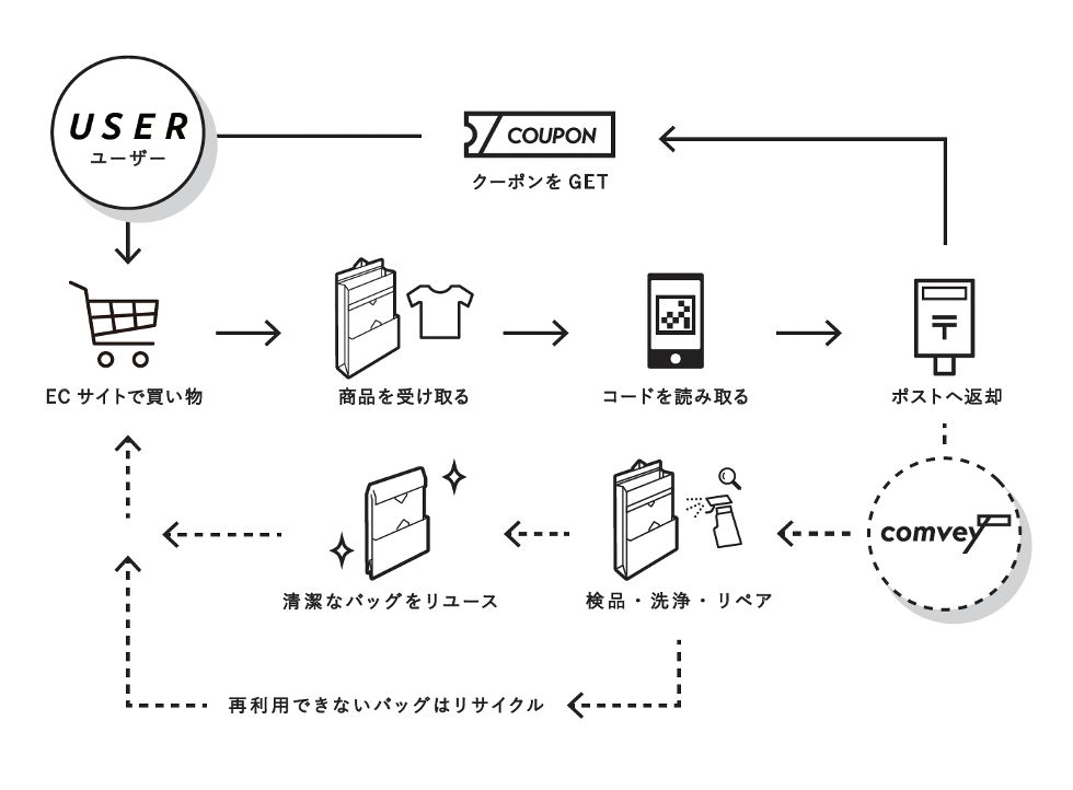 comveyのシステムが導入されたECカートでは、消費者は梱包方法をダンボール等の通常の方法にするかシェアバッグにするかを選択可能。届いたシェアバッグはポストに投函するだけで返却が可能、返却確認ができたら消費者はクーポンを獲得できる。comveyへ返却されたバッグはクリーニング・修繕が施されたのち、再びEC事業者へと提供される。(詳細はこちら https://comvey.jp )