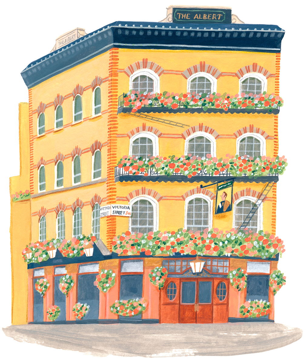 ビクトリア地区にあるアルバートパブ。近代的な闘争ビルに囲まれた中にあるレンガ造りのこのパブはお花いっぱいで飾られていて、思わず足を止め写真を撮らずにはいられないような建物です。
