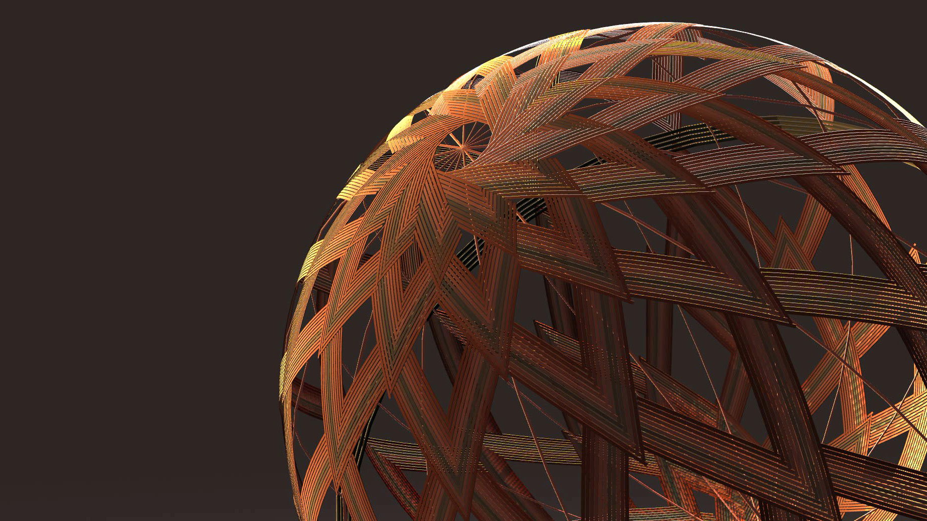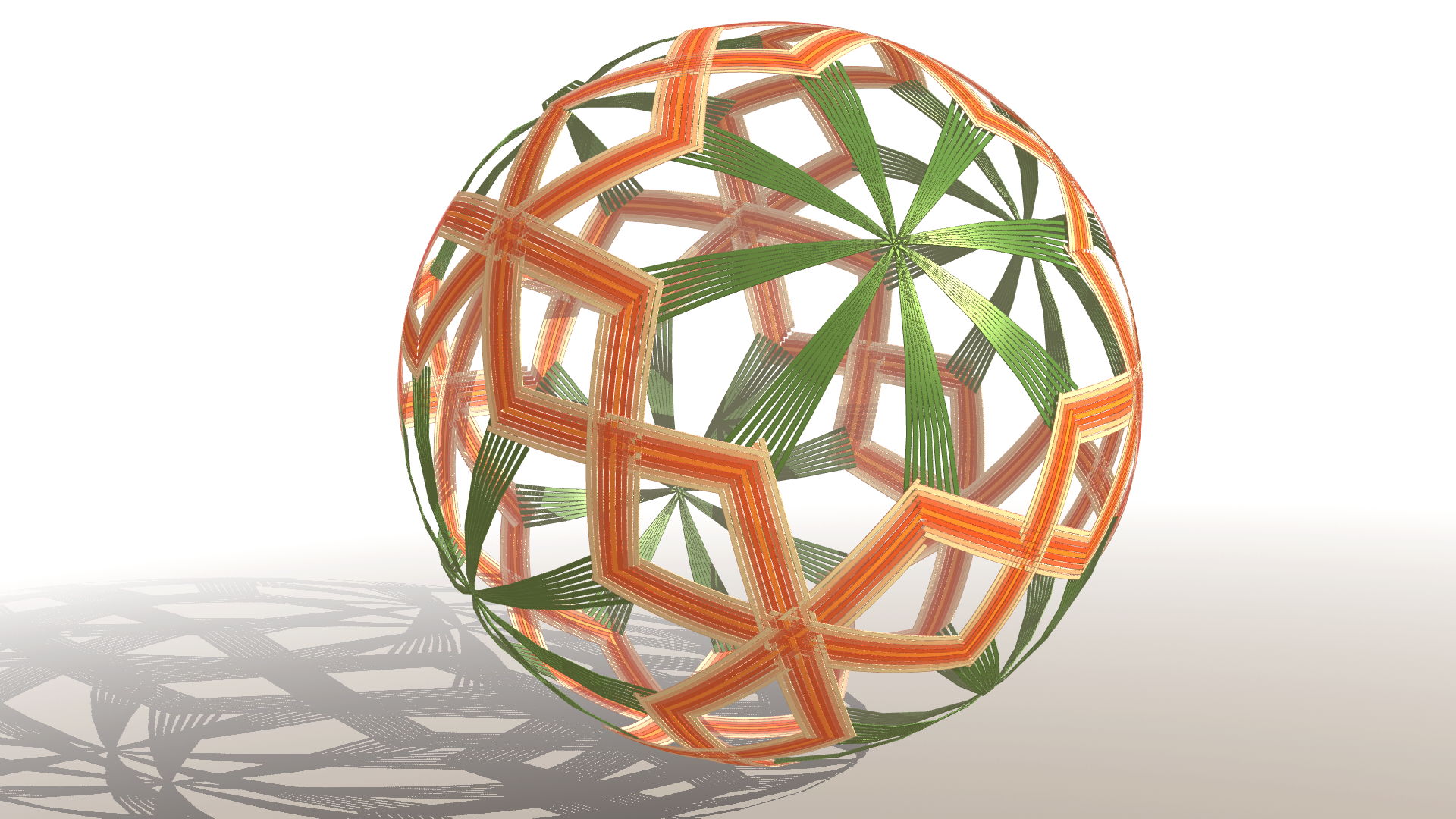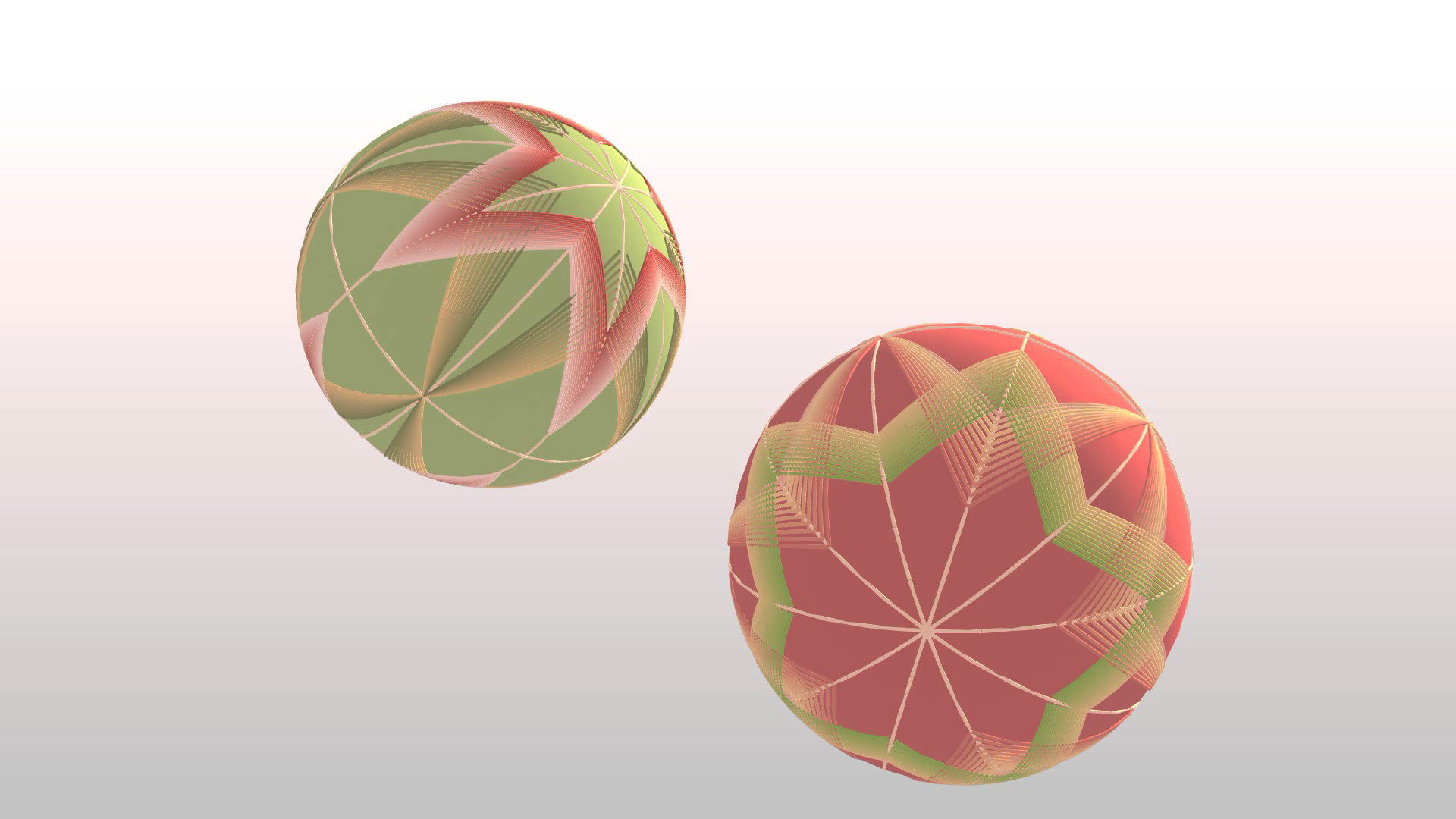 これを数式的に分析し、手毬の表面模様のような球面上の幾何学模様を生成する3DCG生成システムを構築しました。