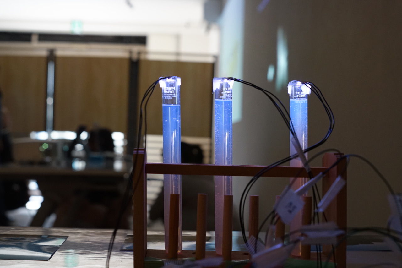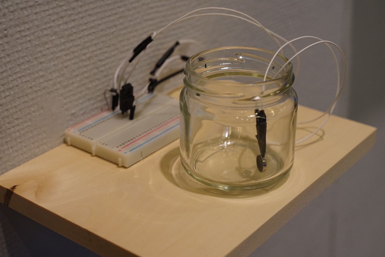 本作品では、コンピュータ上でシュミレーションされた雨が瓶の中に入ると振動子が震えることで音が鳴る。また、雨はあなたの心拍のリズムに合わせて生成されるようになっている。