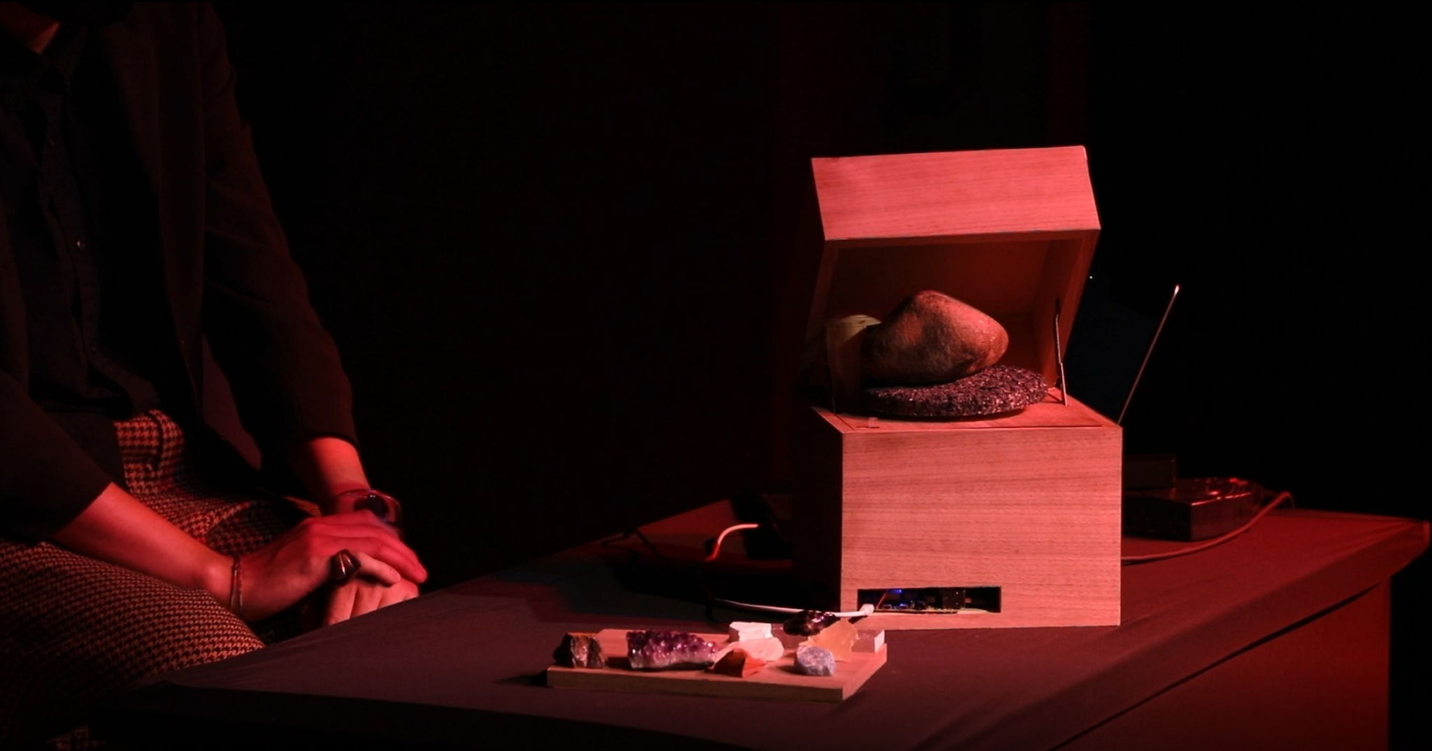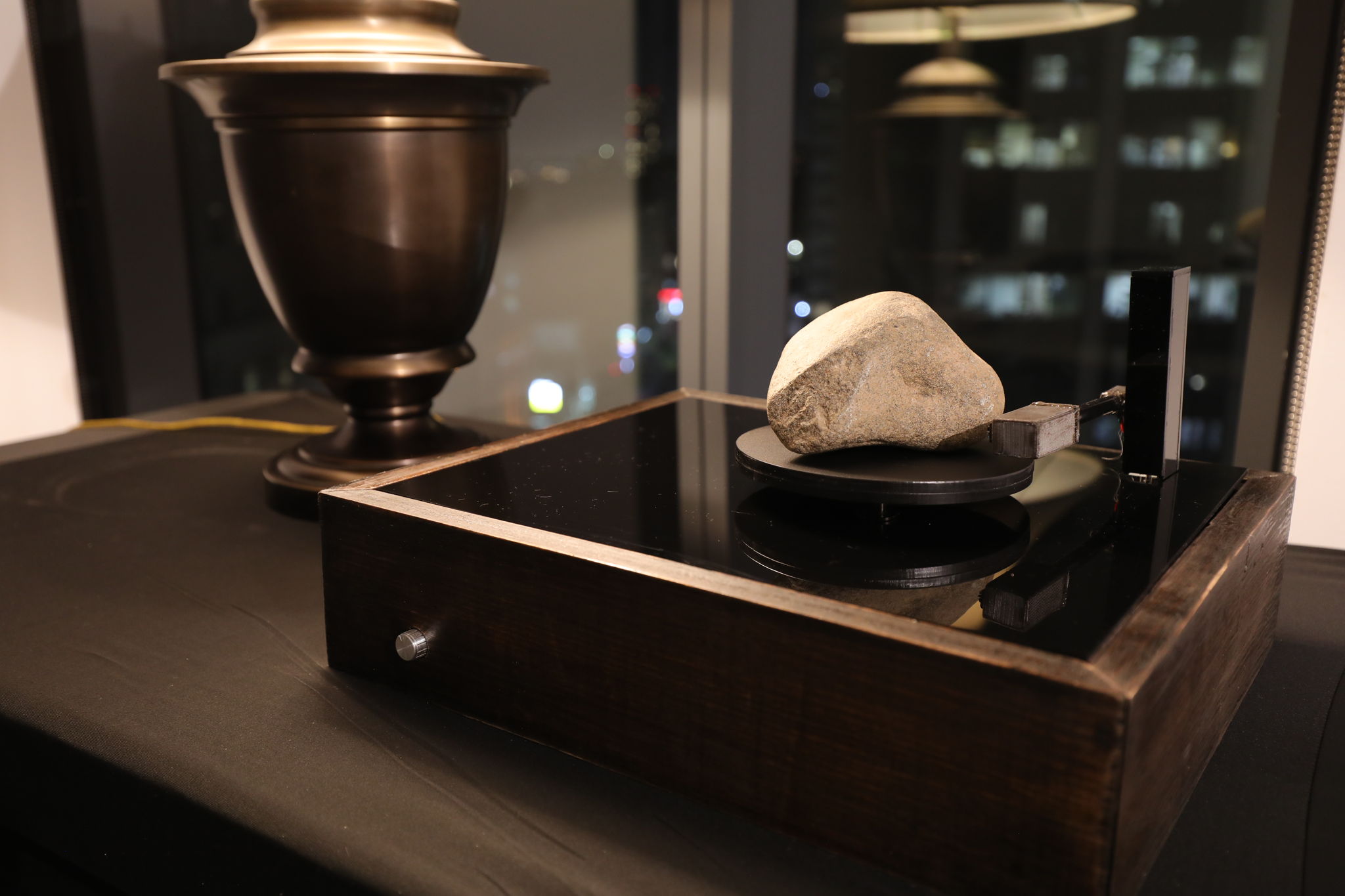 石をターンテーブルに置くことでセンサーが石の形状・テクスチャ・重さをスキャンし、リアルタイムに音へと変換します。