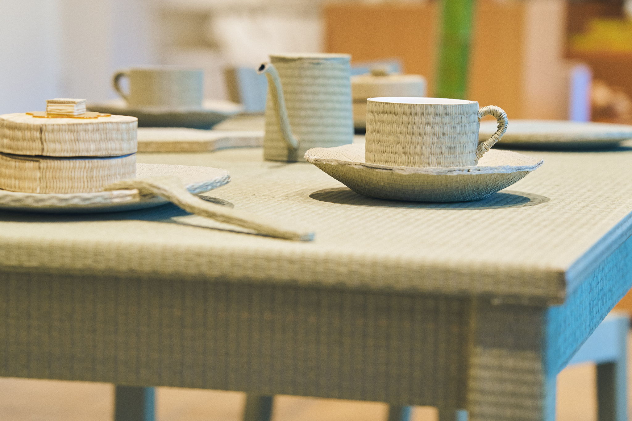 本作はティーカップ、ポッド、食器やカトラリーなどを畳表で巻いた作品である。