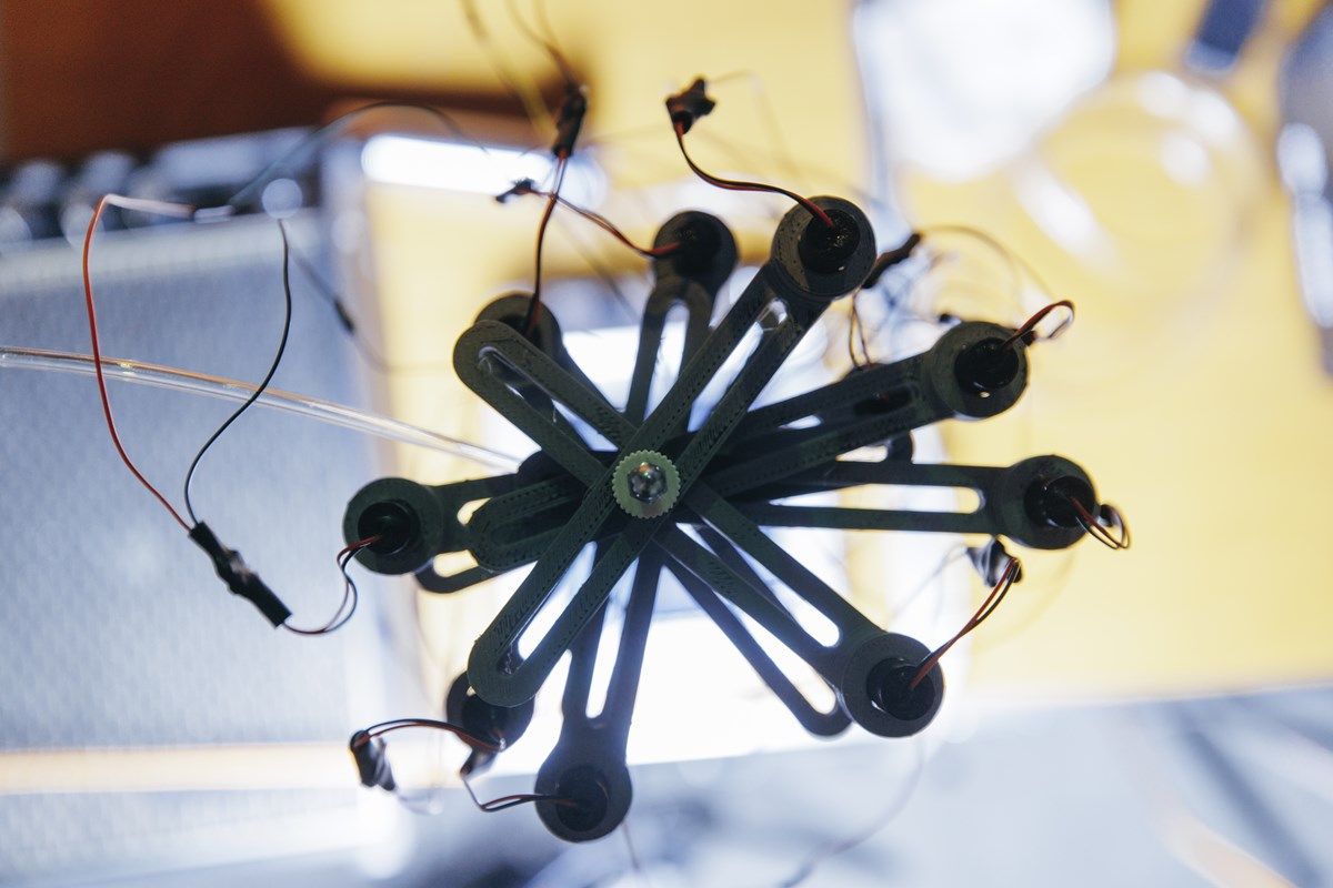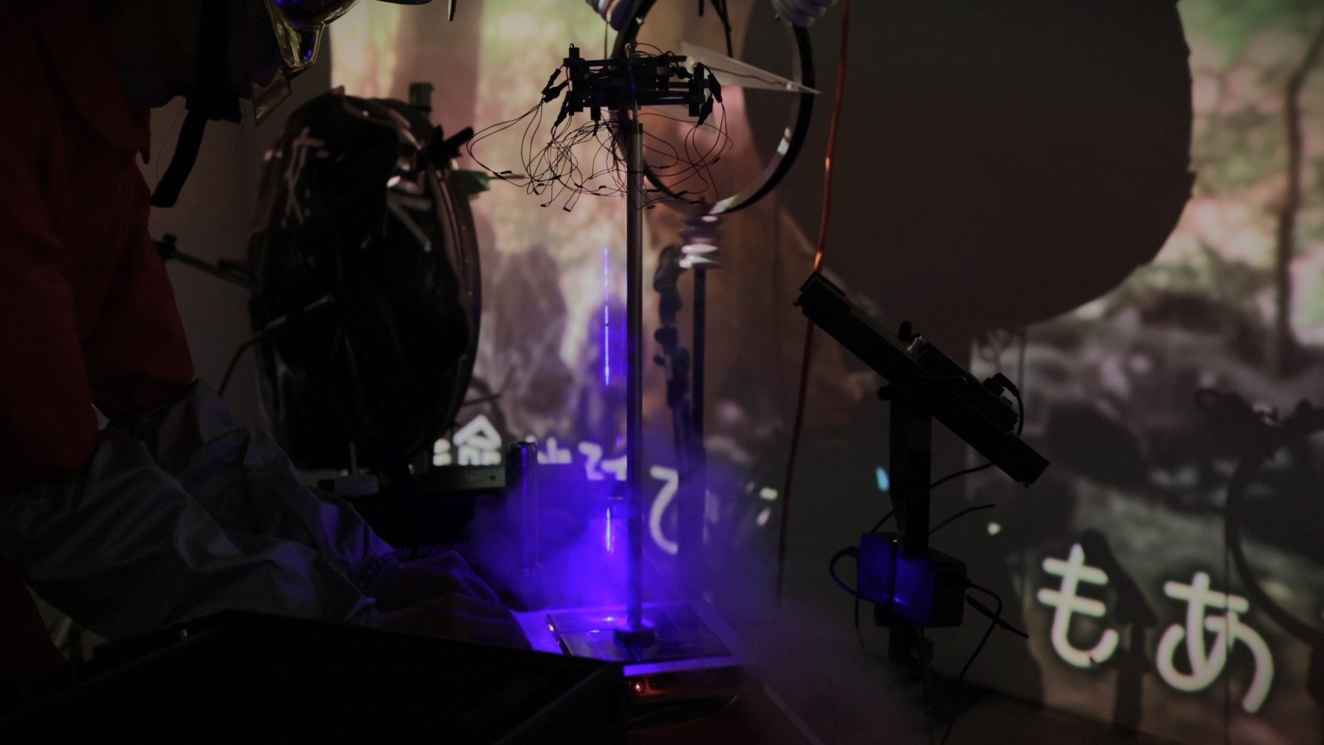 LASER CLOUDの雲が降らせる雨は、本物の雨を構成する「水」ではなく「光」です。本来対照的とも言える光を用いた実験装置に置き換わっています。降雨という自然現象の構成要素をテクノロジーで入れ替え組み換え、人間がコントロールできるようにした結果、置換化石のような楽器が生まれました。