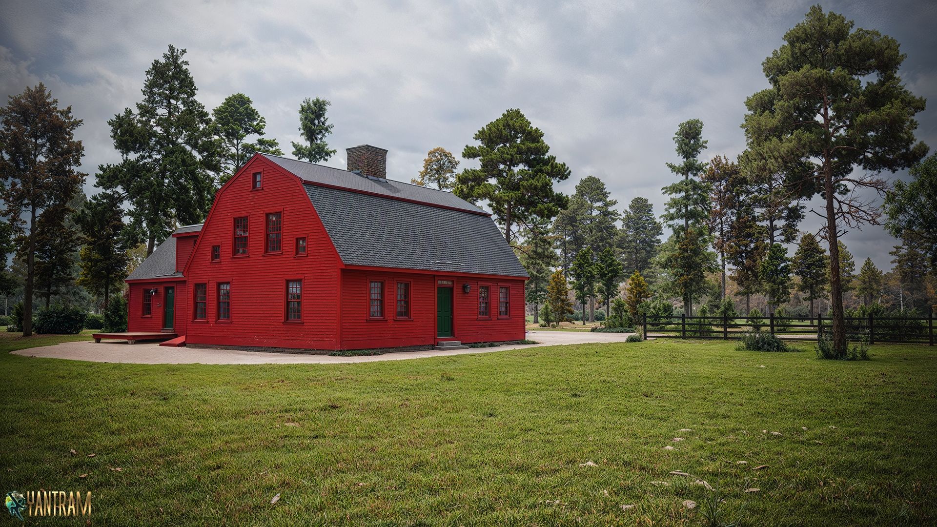 The ground is meticulously detailed, highlighting the textures of gravel paths, manicured lawns, and garden beds that enhance the overall aesthetic. Yantram Studio’s expertise ensures that every element of the rural landscape is captured with 3d architectural visualization studio precision, delivering a visual experience that celebrates the charm and tranquility of country living.