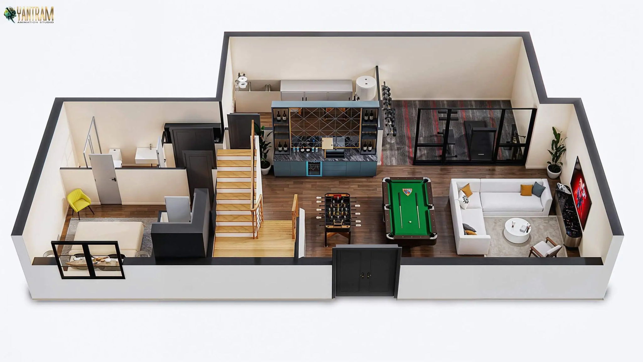 Inside the home, Yantram excels at creating detailed 3D floor plans that allow clients to visualize the layout and flow of spaces. Their interior renderings bring rooms to life, from cozy living areas to sleek bar designs.