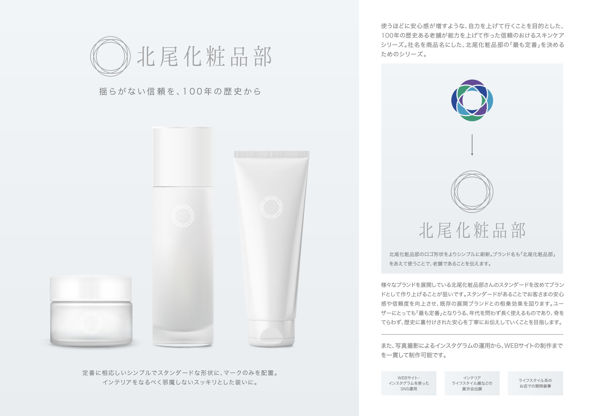 北尾化粧品部のロゴ形状をよりシンプルに刷新。ブランド名も「北尾化粧品部」をあえて使うことで、老舗であることを伝えます。
