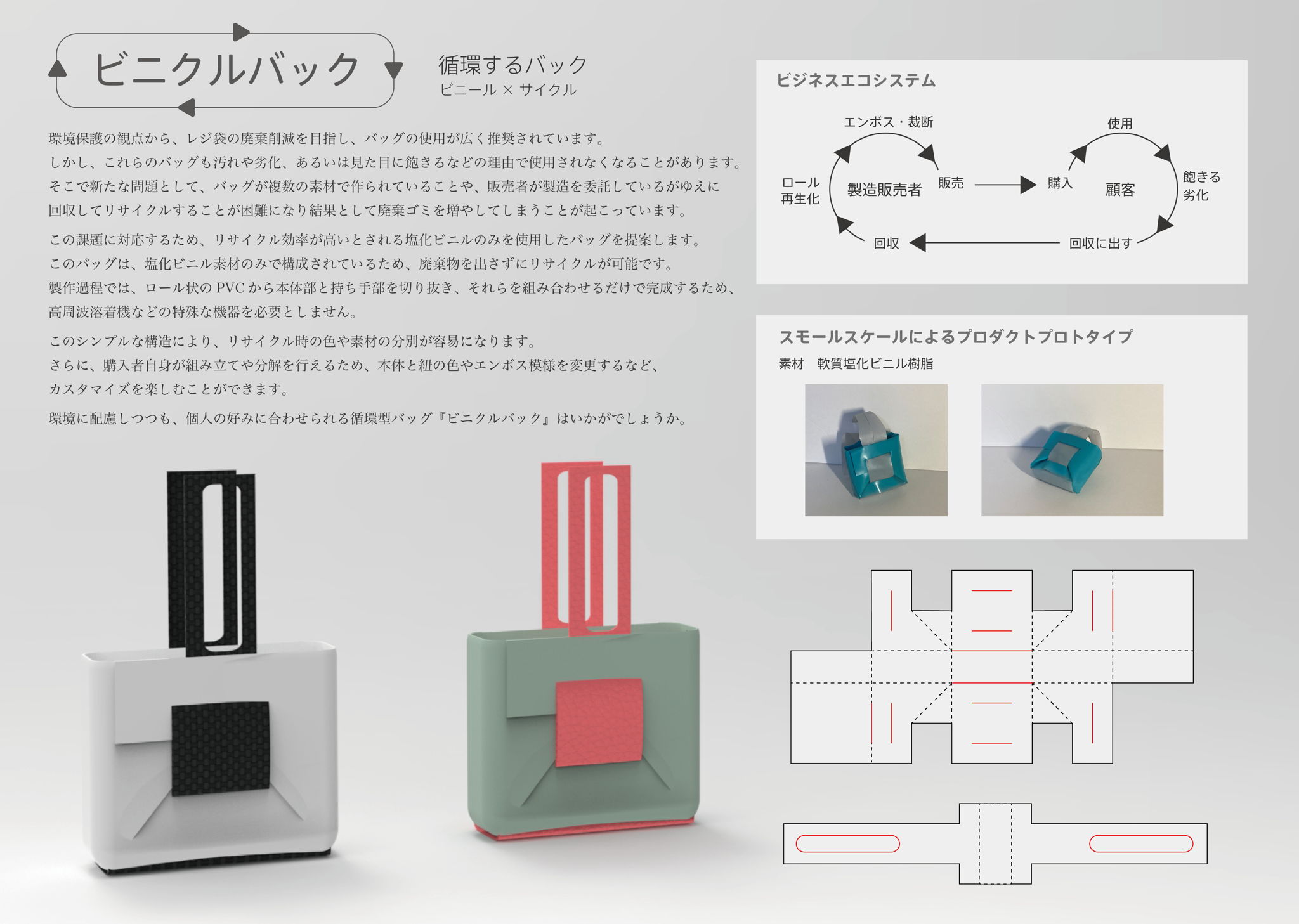 この課題に対応するため、リサイクル効率が高いとされる塩化ビニルのみを使用したバッグを提案します。