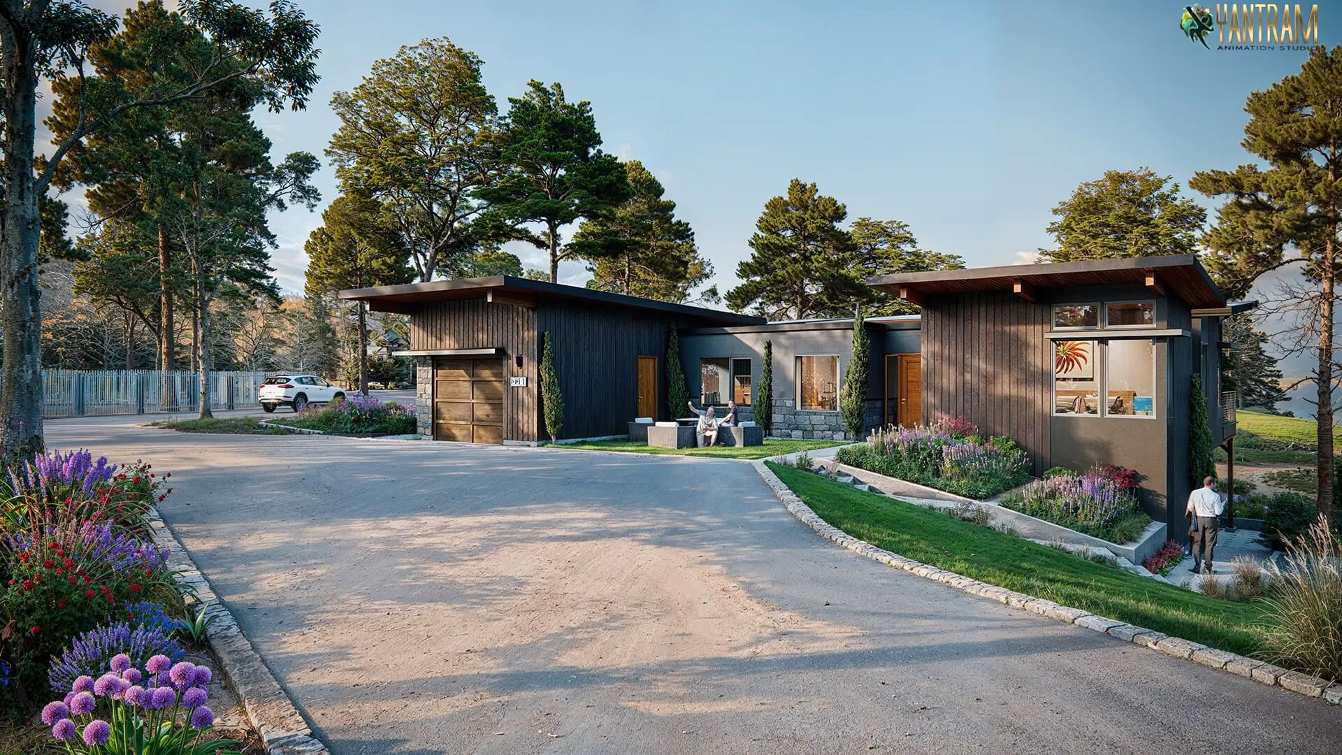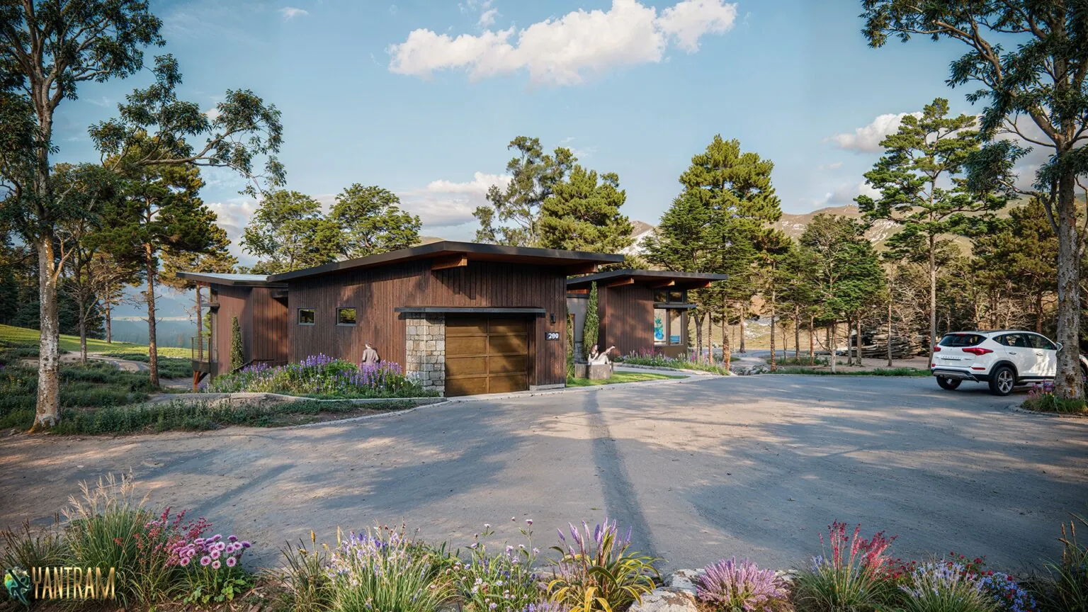 Yantram Studio’s 3D visualization service offers a perfect blend of creativity and technical precision, delivering a complete picture of hillside house exterior designs that include the house, garden, plantation, and parking area, giving clients a comprehensive understanding of their future property.