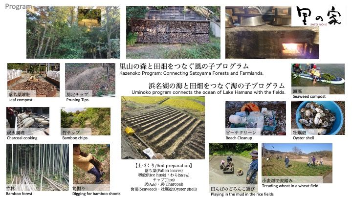 浜名湖で活動している「海の子」では、カヤックや釣り、自然観察、ビーチクリーンなどのアクティビティをしています。釣った魚は天ぷらにして食べます。海藻やカキ殻を集め肥料にしています。里の家は浜名湖につながる都田川の近くにあり、里・川・海の大きな循環も伝えています。これらが、里山体験、里海体験の概要です。