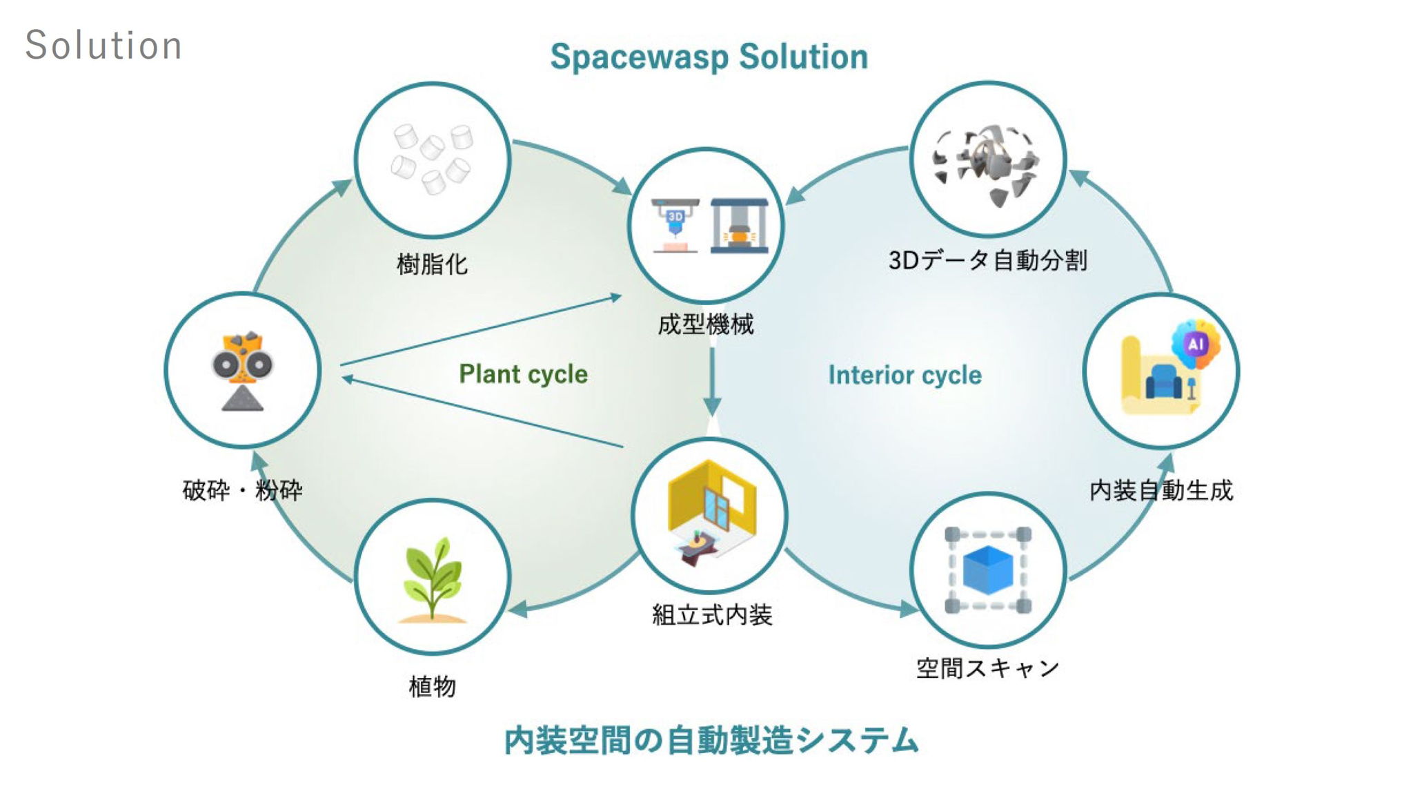 We are a company that manufactures and sells plant-based interior spaces (including interiors, furniture, and building materials) from plant waste generated by various industries. In response to the shortage of skilled workers in the interior design industry, we provide an automated system for creating spaces and a circular model that allows for interiors to be reconstructed repeatedly. Our goal is to establish a new interior infrastructure for the future, offering interior solutions for businesses such as hotels, offices, and retail stores where interior spaces are essential.
