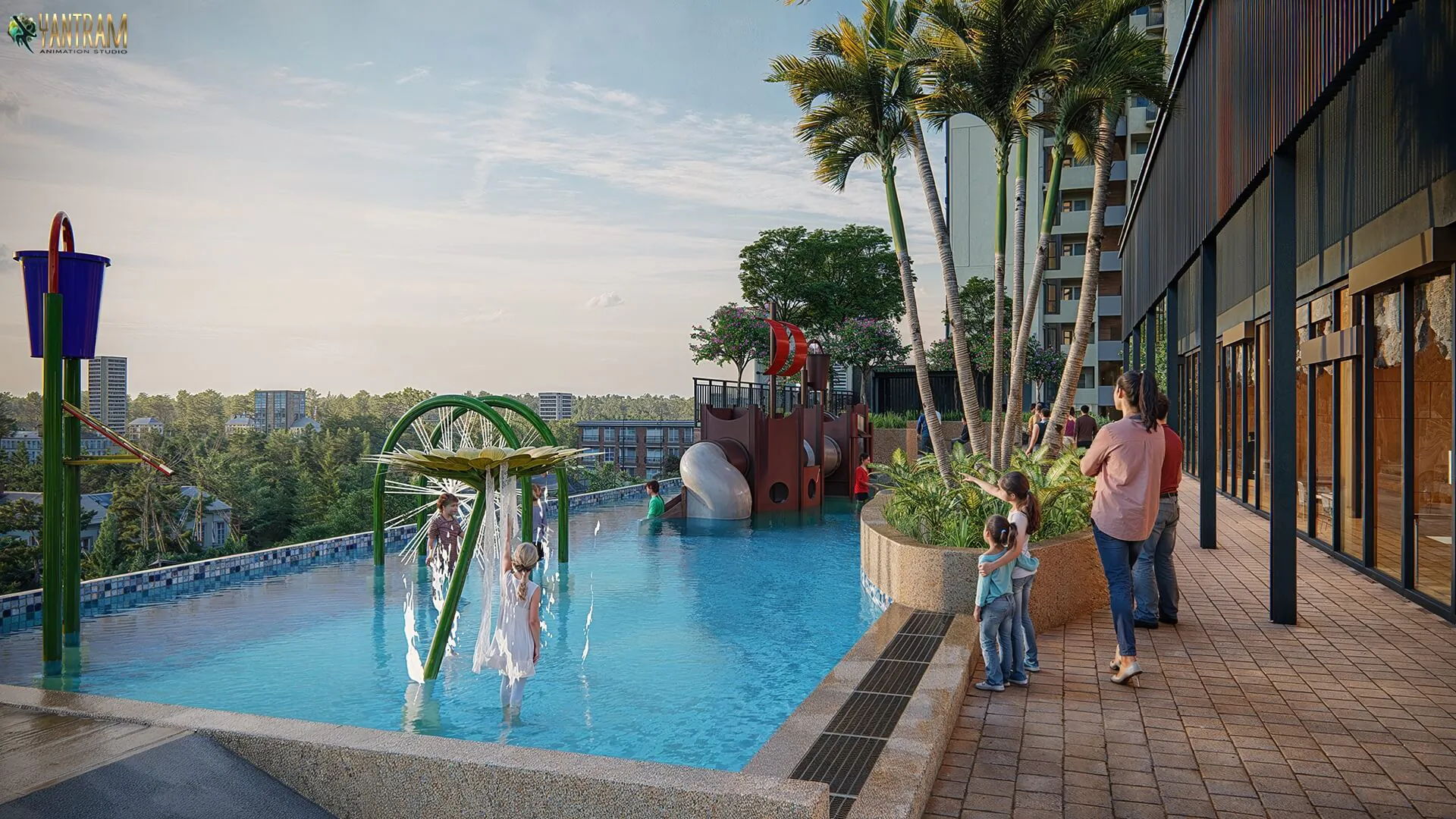 Yantram Studio specializes in creating stunning 3D architectural animations, showcasing innovative outdoor pool designs in Jerusalem, Israel. The outdoor pool design is envisioned as a serene oasis, harmoniously blending with the city's rich historical backdrop and vibrant landscapes. The 3d architectural rendering studio pool area features a contemporary infinity-edge design, providing breathtaking views of the surrounding hills and iconic skyline.
