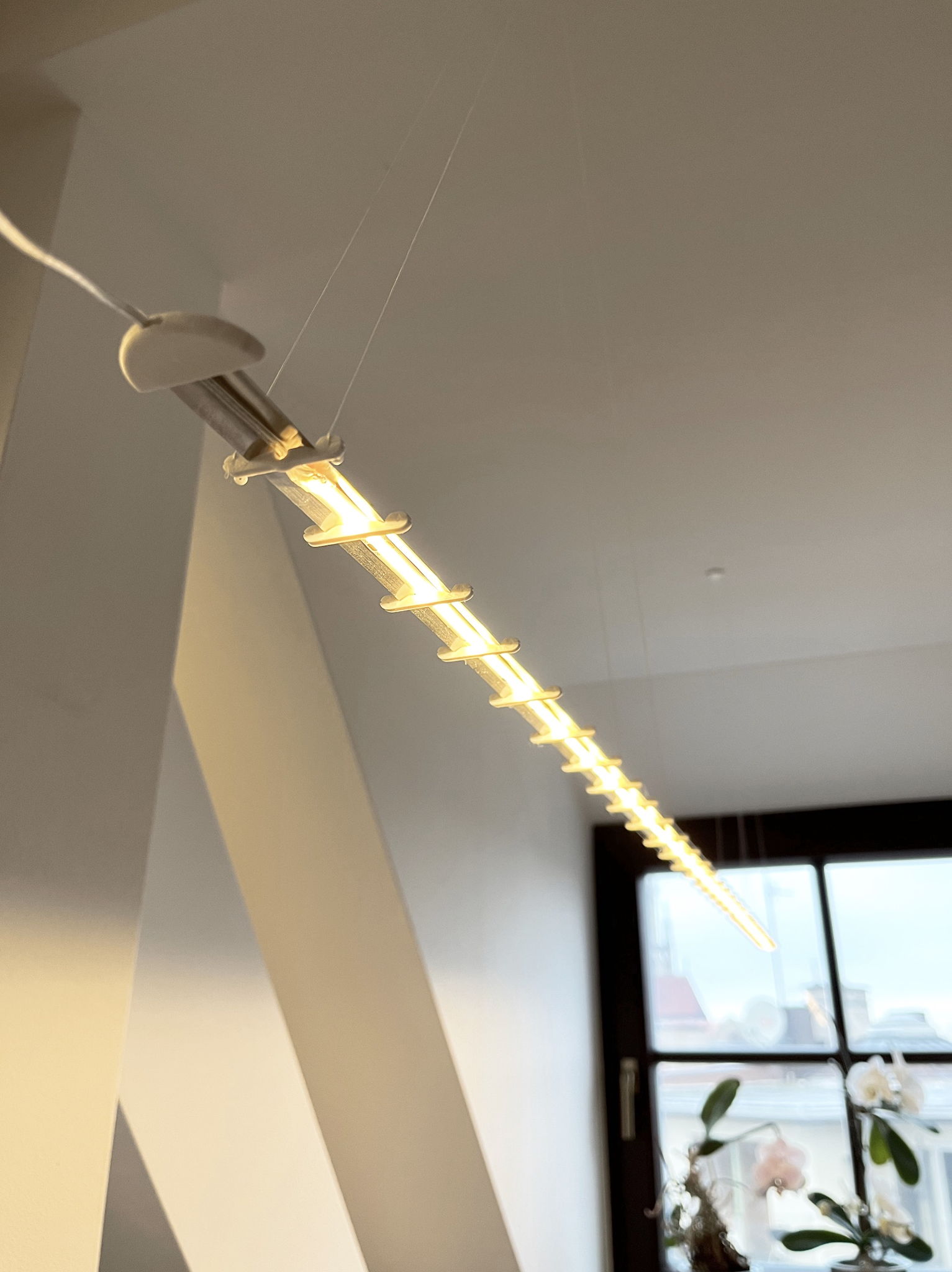 The intention for the design of Cobralight Pendolo was to reduce the material required for a pendant lamp to a minimum, while allowing for the lamp to be efficient, repairable, durable, modular, adaptable and compact to transport/ship.