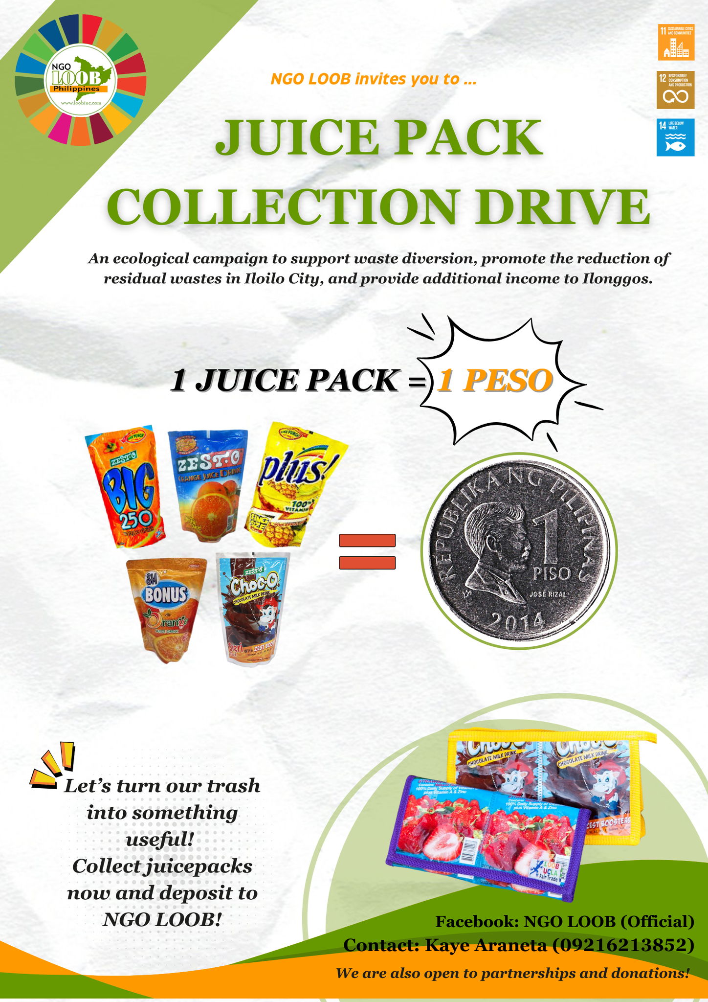 Waste recyclers and local residents collect the juice pack wastes, selling them to LOOB for 1 peso per piece through our organization’s Juice Pack Collection Drive. After being sanitized, these packs are handed over to skilled artisans who transform them into beautiful, upcycled products. This project not only promotes waste diversion but also creates sustainable livelihoods for marginalized sectors, fosters the practice of upcycling and waste recovery, and contributes to waste diversion initiatives.