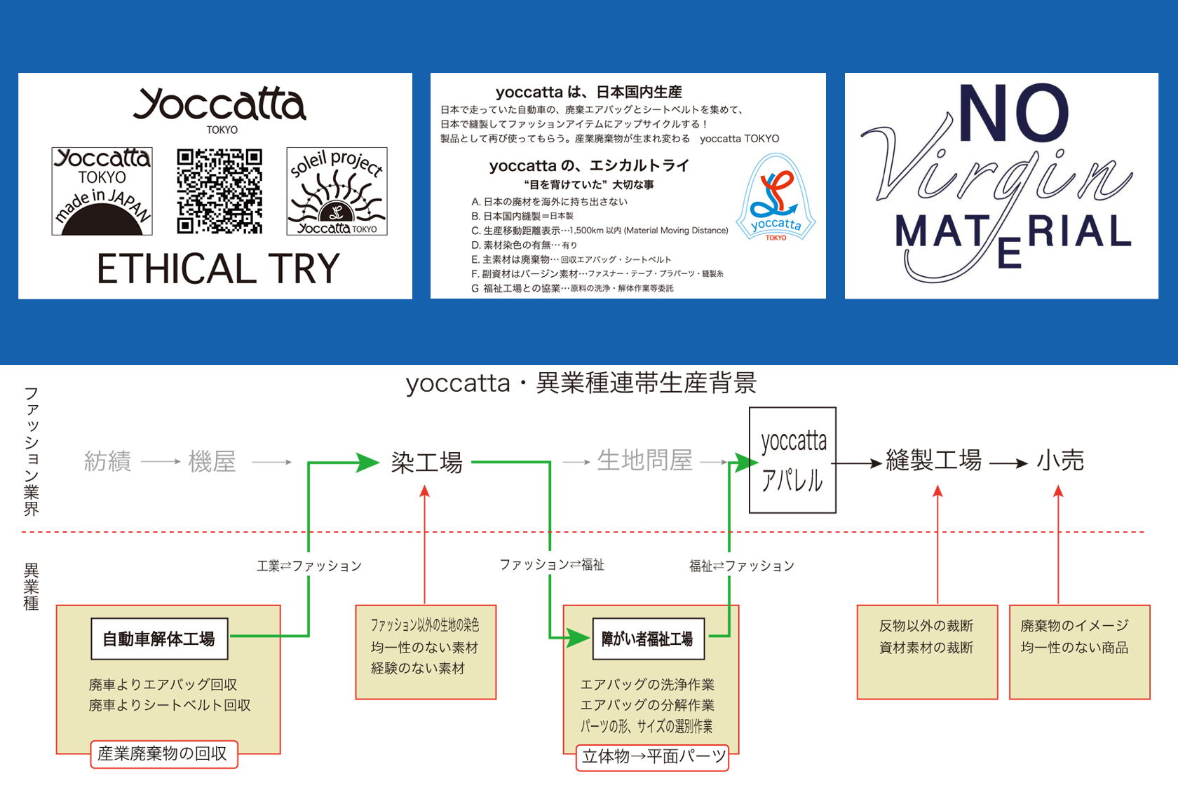 地上資源とは、既に我々の周りにある廃棄された工業製品を資源とみなすことを意味します。一方、バージン素材は地下資源から生み出すのでエネルギーを使います。yoccattaは、地上資源をファッションの力で蘇らせる(再生する)プロジェクトと言えます。何より、エアバッグを再利用することで、焼却処理を回避でき、CO2を出さずに済んでいます。また、裁断クズの管理が難しい海外生産をせず、そのクズも国内で再利用しようと努めています。『日本の産業廃棄物を国外に持ち出さない』という倫理的な意味合いも私たちが大切にしているコンセプトです。国内生産にした事で輸送距離が大幅に削減され(6000km→1500km)CO2を削減できました。これらの取り組みのように、大切なことから目を背けないことを『yoccattaのエシカルトライ』といいます。