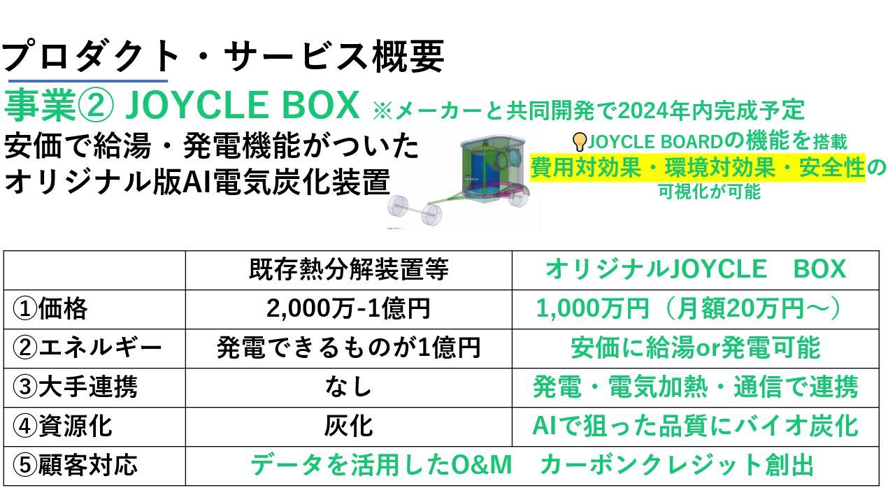 2. 革新的な処理装置の開発: JOYCLE BOXという小型AI電気制御炭化装置を開発し、多様な廃棄物を効率的に処理しエネルギーを生成します。
