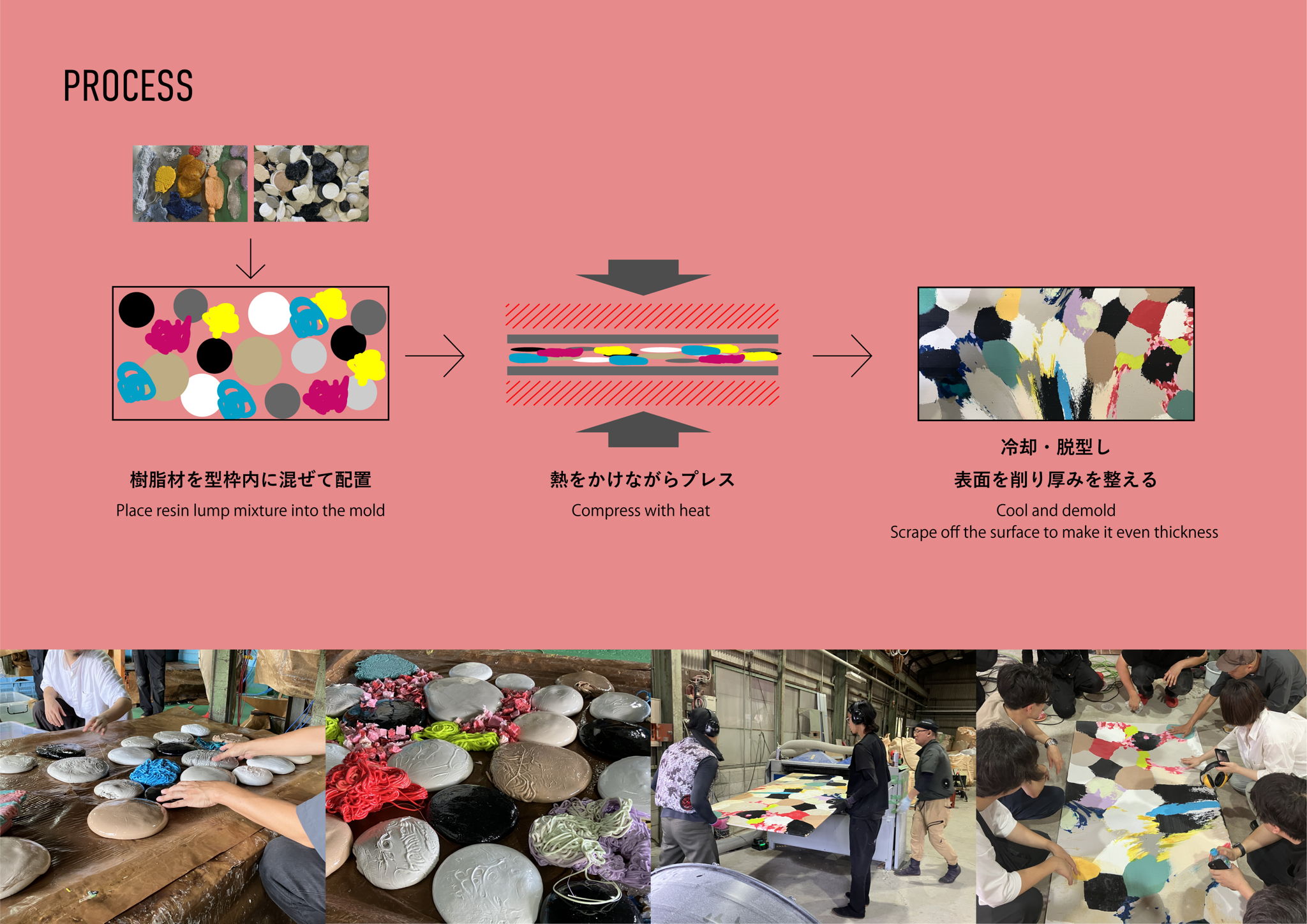 それぞれの事業部から出た樹脂のかたまりを混ぜ合わせ、熱をかけて溶かしながらプレスすることで天板を形成しています。