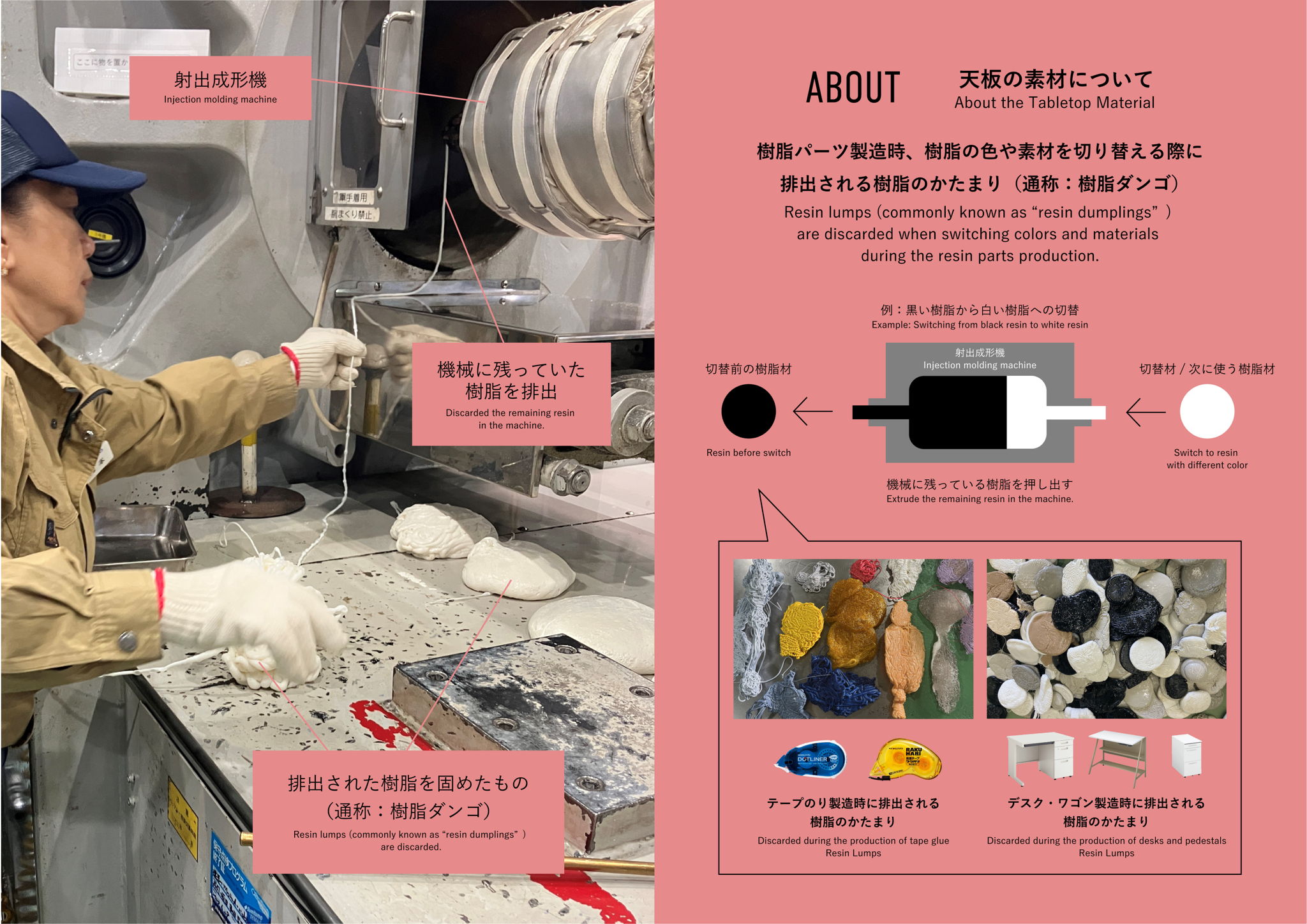 In the office renewal opportunity intended to create a place for employees with different backgrounds to gather and collaborate, we finally decided on resin, commonly discarded material from each division.