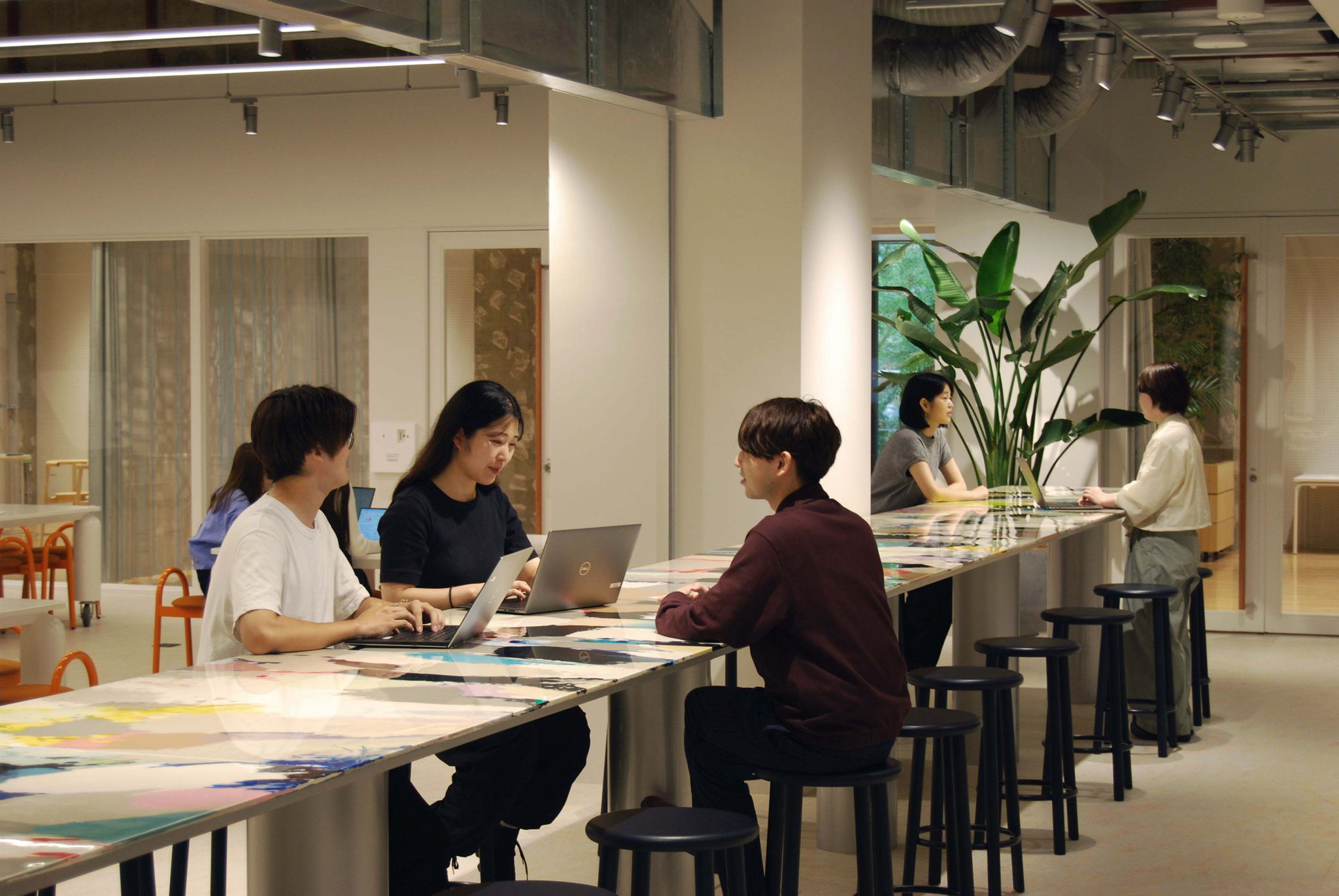 用途が異なる、様々な色、大きさの樹脂材が混ざり合ったデザインは、部署や立場、企業間の垣根を超えた共働を目指す新フロアのコンセプトを体現しています。