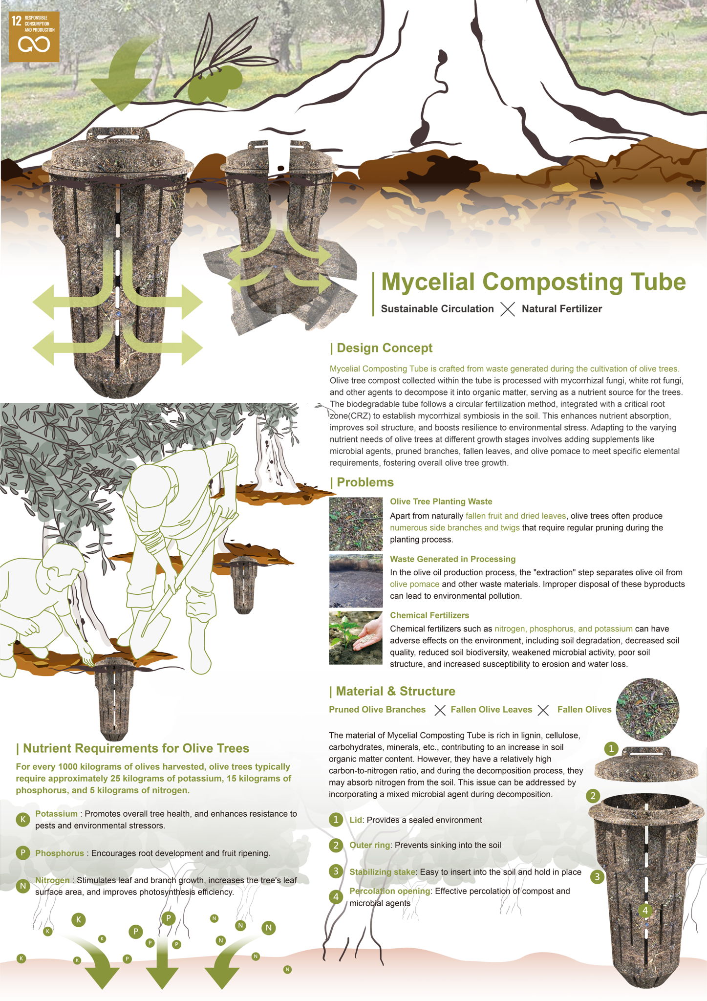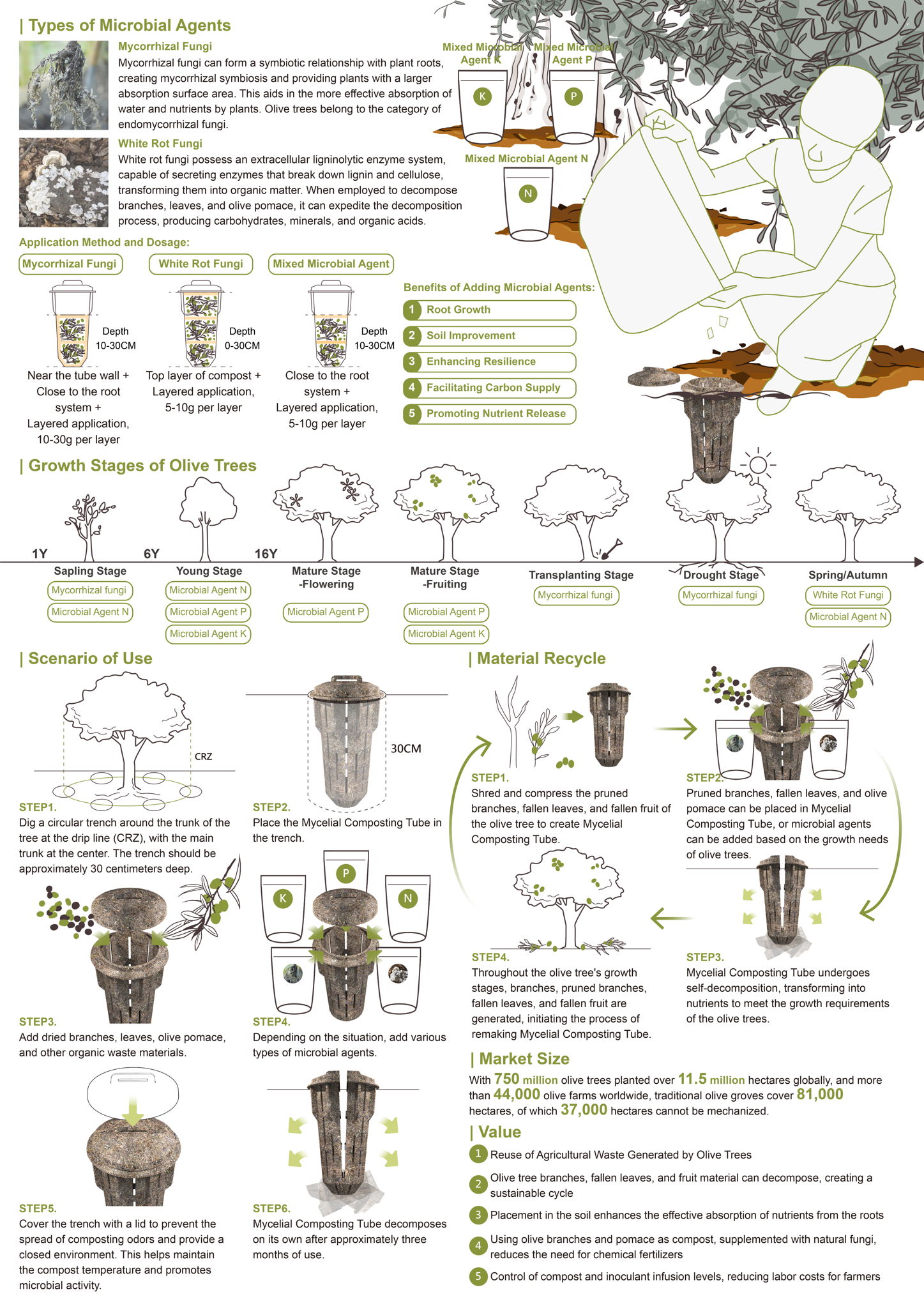 Mycelial Composting Tube is crafted from waste generated during the cultivation of olive trees. Olive tree compost collected within the tube is processed with mycorrhizal fungi, white rot fungi, and other agents to decompose it into organic matter, serving as a nutrient source for the trees. The biodegradable tube follows a circular fertilization method, integrated with a critical root zone(CRZ) to establish mycorrhizal symbiosis in the soil. This enhances nutrient absorption, improves soil structure, and boosts resilience to environmental stress. Adapting to the varying nutrient needs of olive trees at different growth stages involves adding supplements like microbial agents, pruned branches, fallen leaves, and olive pomace to meet specific elemental requirements, fostering overall olive tree growth.