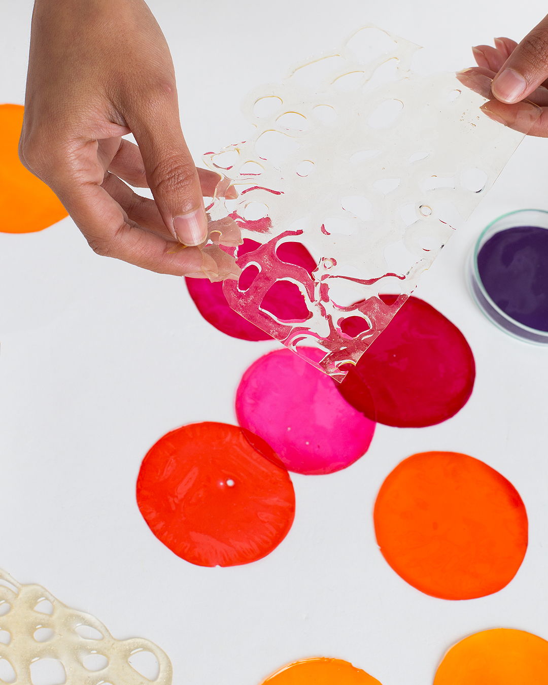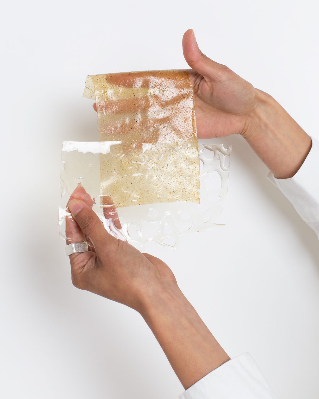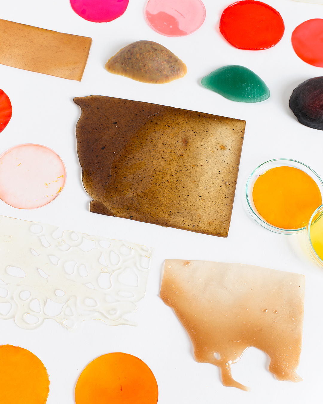 Samples were made taking into account hardness, fragility, flexibility, transparency, density and errors to create a playful catalogue expressing these qualities in the registers. The manufacturing process started with base recipes, using materials such as gelatine, starches and algae, and organic material such as eggshells, banana skins, turmeric, onion skins, and potato skins. From this material, a process of drying and crushing is carried out to pass to the manufacturer by means of a recipe as in the traditional kitchen. It is left to dry while observing its transformations.