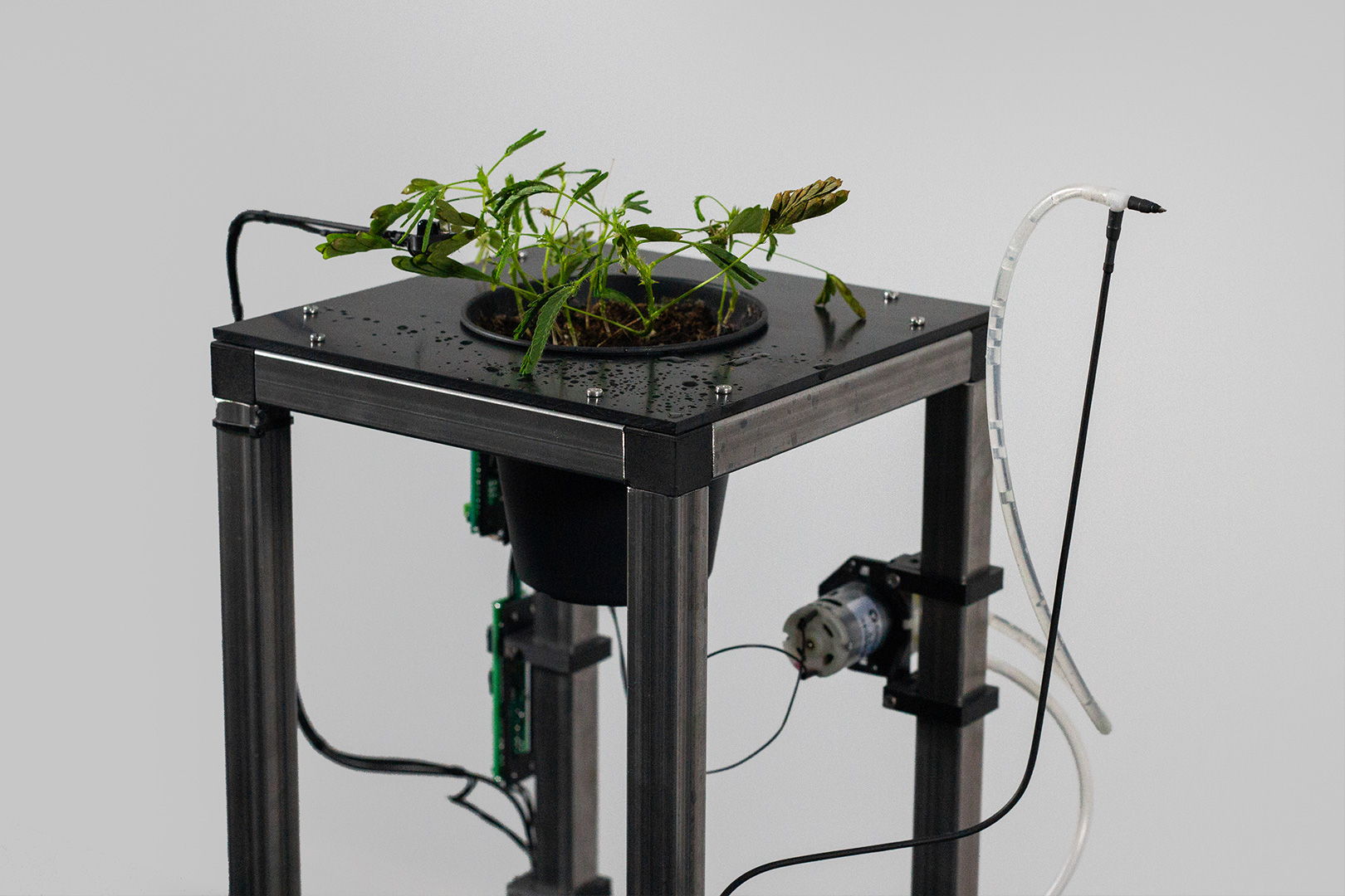 The transmission of the signal is started by a soft touch of a branch above the installed infrared proximity sensor. The plant's leaves fold as the branch approximates the sensor. A certain closeness to the sensor will start the pump and the next plant will be contacted and watered. The Mimosa pudica reads the signal, reacts and starts the next transmission.