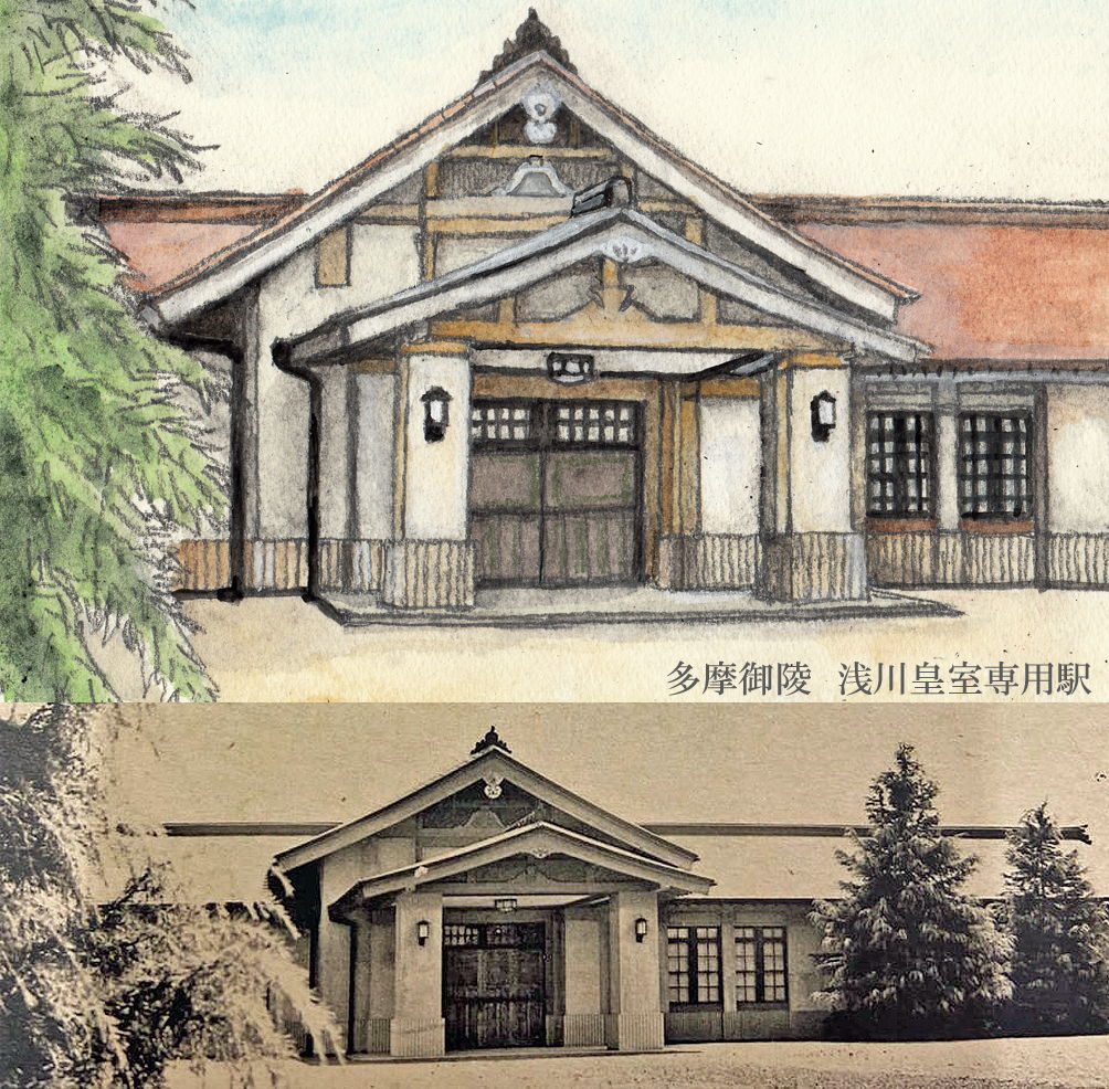1990年にテロ事件で焼失した旧皇室専用駅の東浅川駅の再現画。