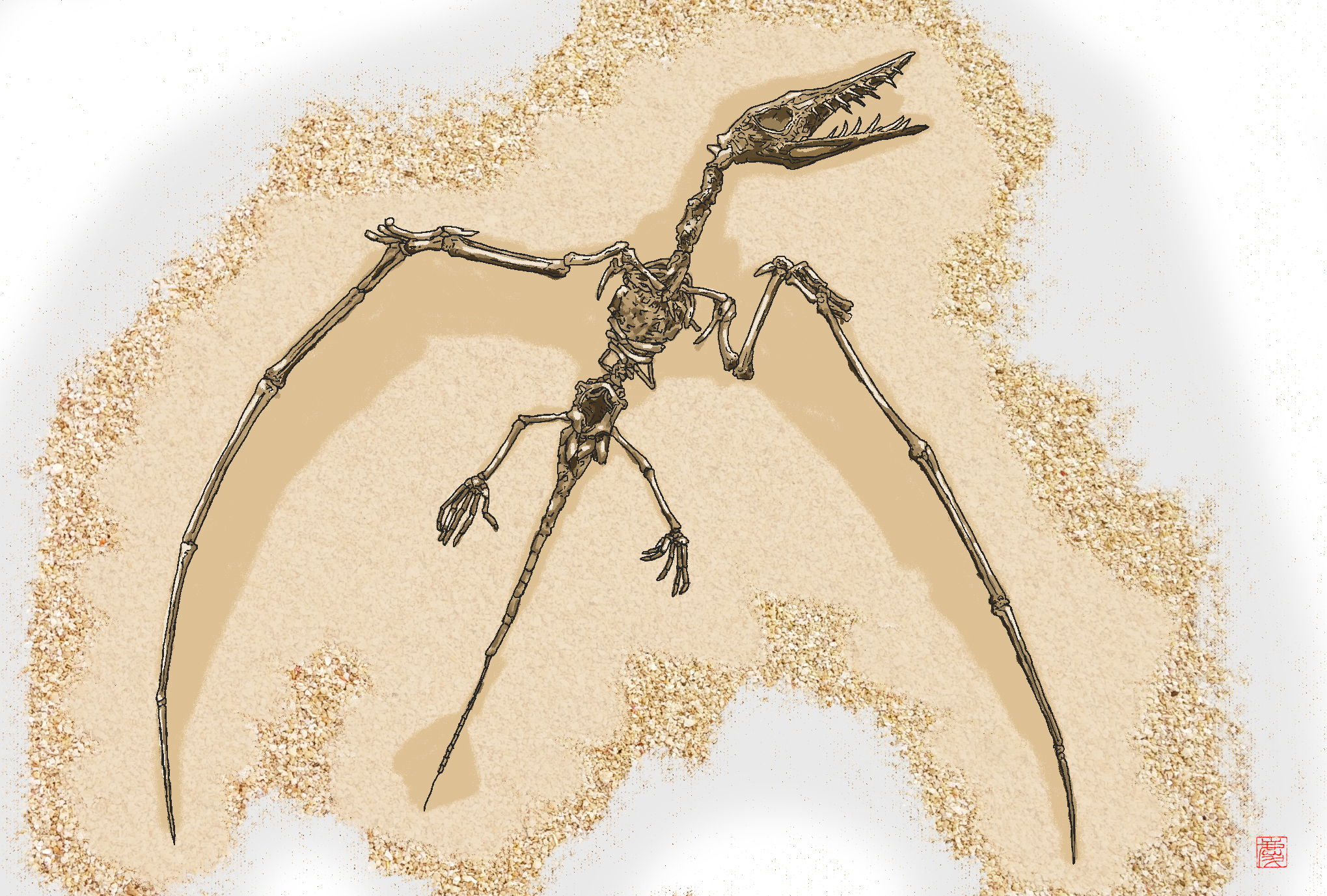 翼竜ランフォリンクスの骨格化石を、マウス画で落書きっぽく着色しました。