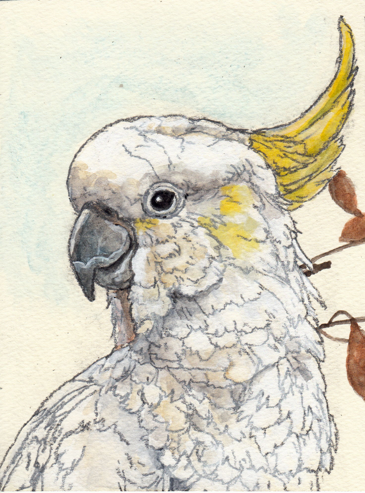 人気のオウム、キバタンを水彩スケッチで描いてみました。