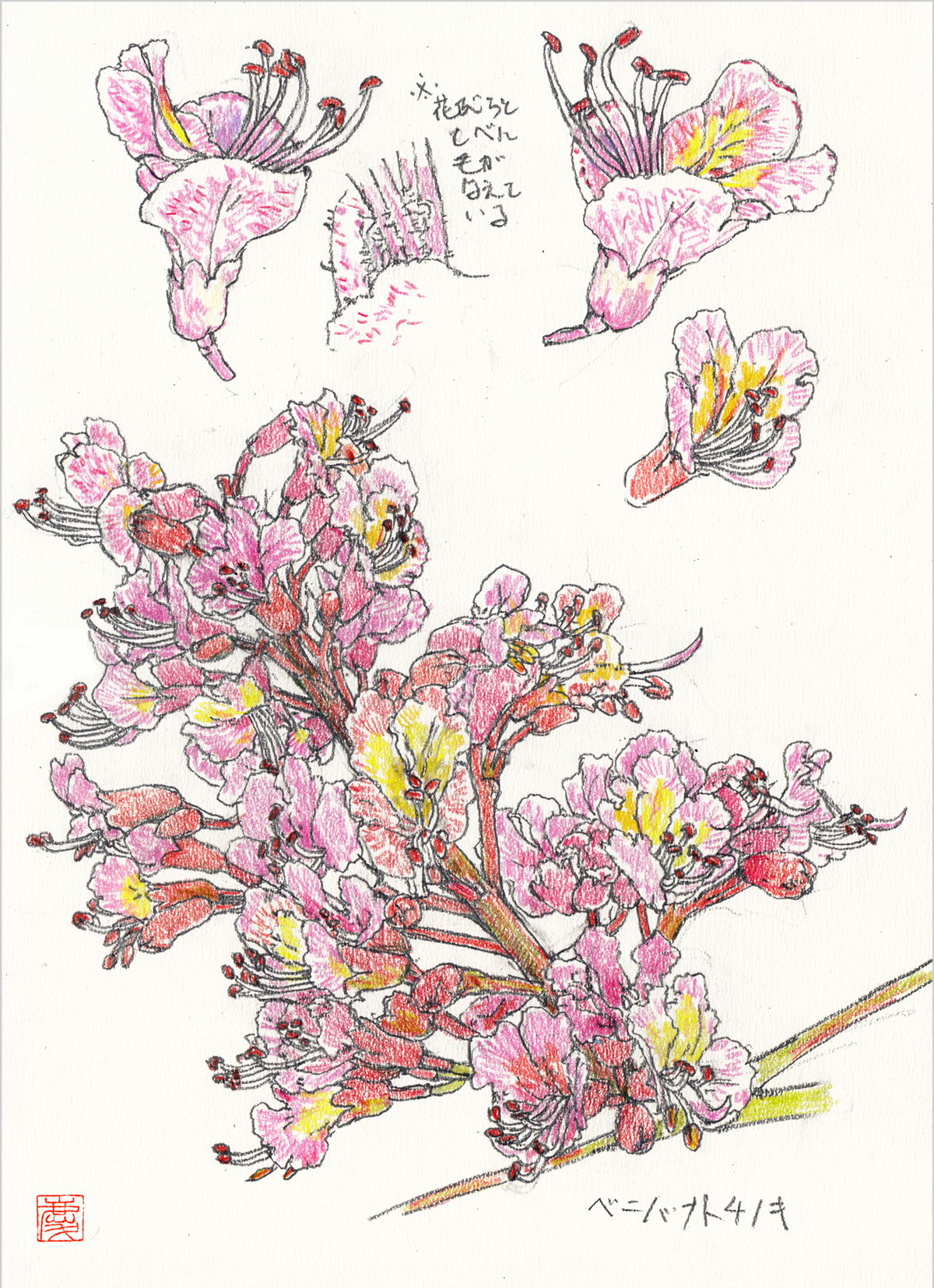 ベニバナトチノキの花のスケッチ(色鉛筆)