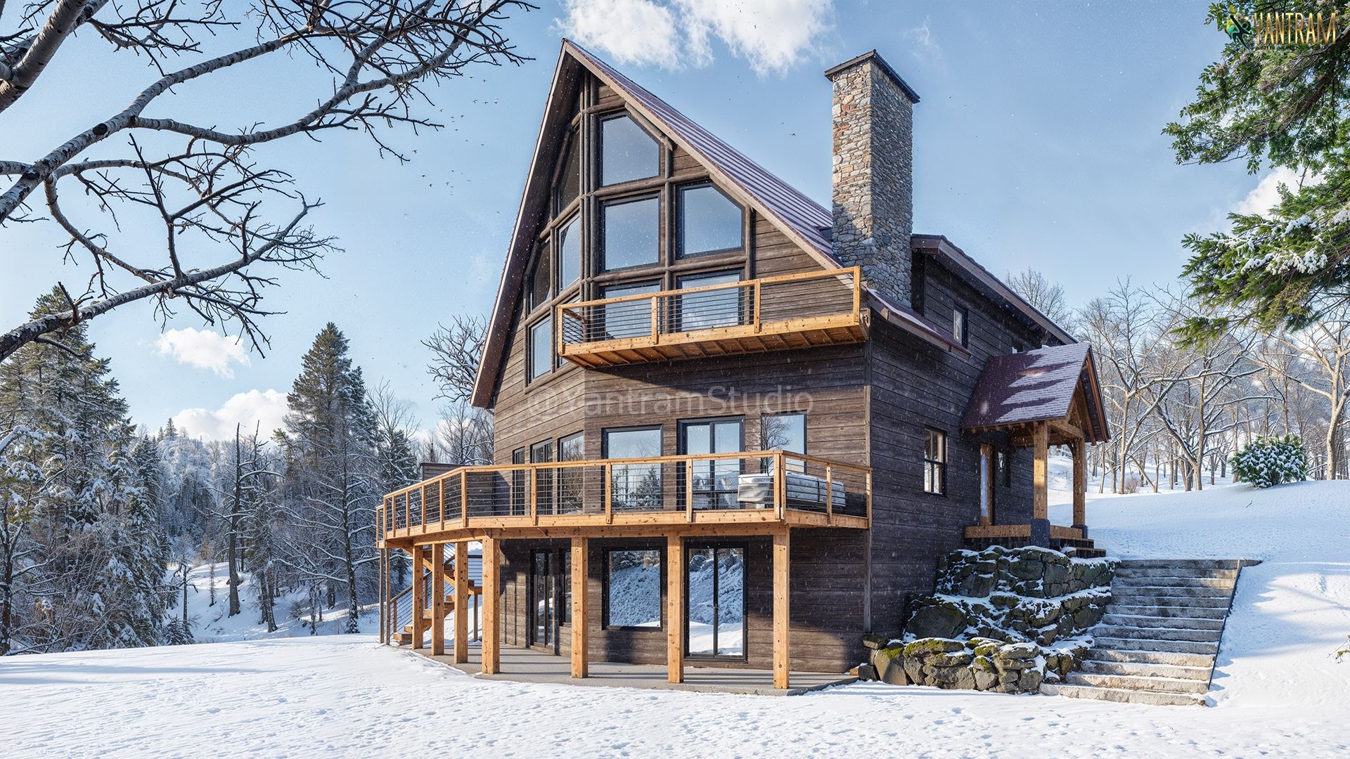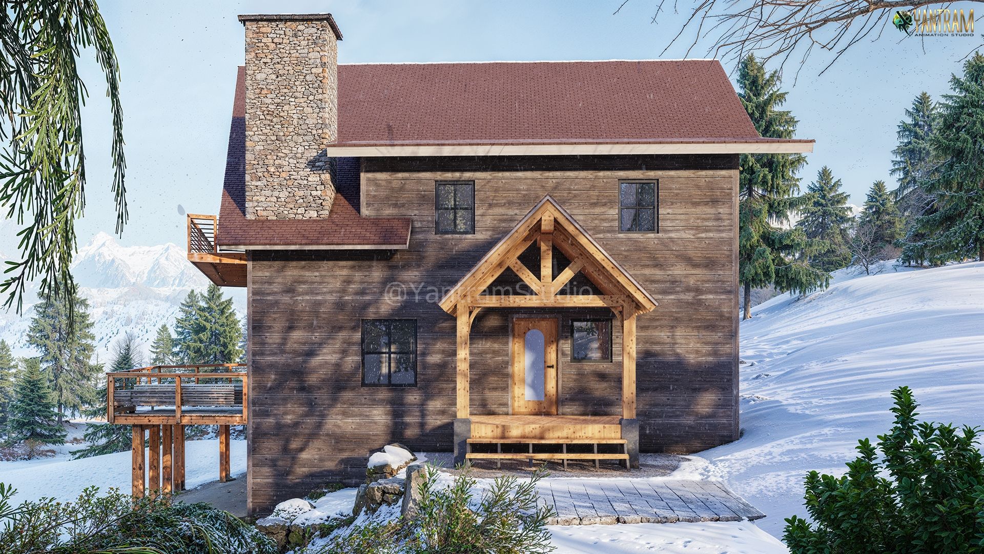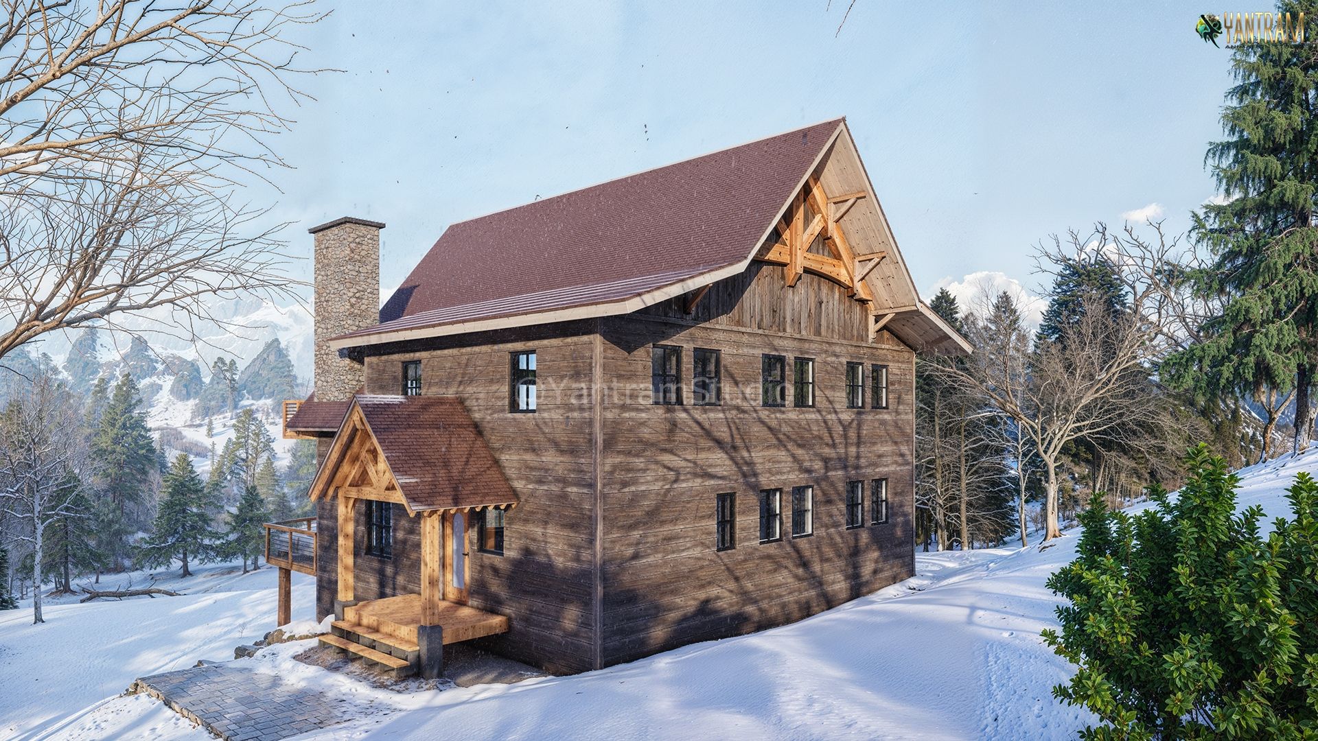 Yantram Studio specializes in high-quality 3D architectural rendering services, This stunning winter cabin visualization showcases the expertise of a top-tier Exterior Rendering Company. Using cutting-edge 3D techniques, the image highlights realistic textures, detailed woodwork, and lifelike snow effects, perfectly blending nature and architecture. Ideal for architectural presentations, marketing, and client approvals, it brings design concepts to life with precision.