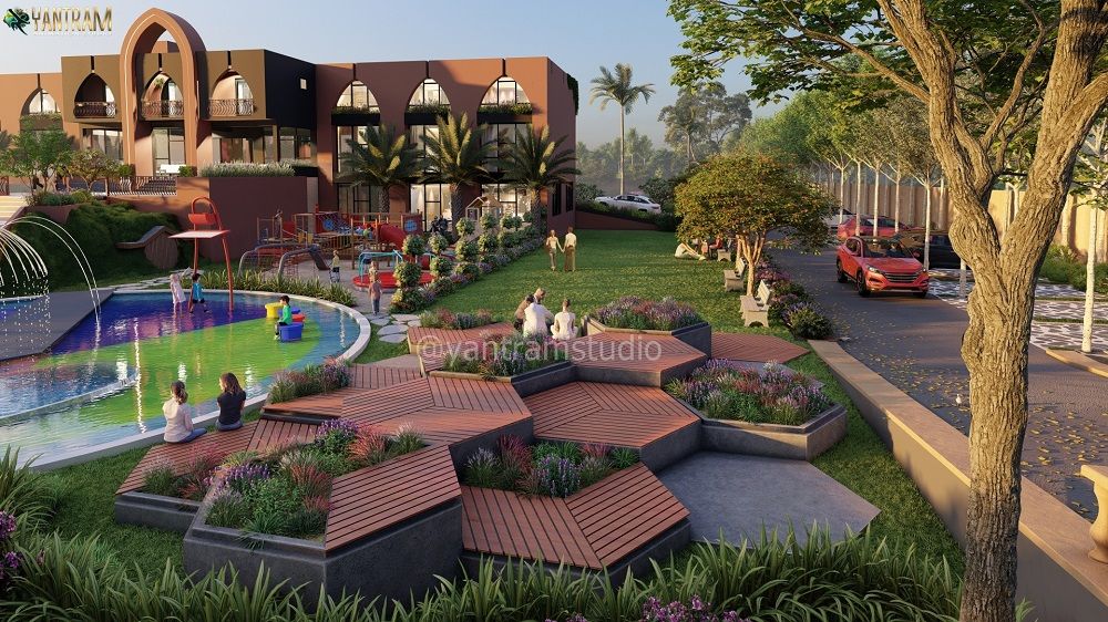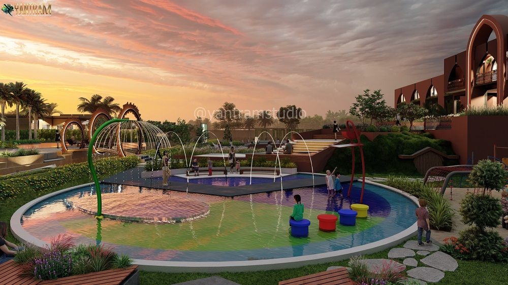 Step into the future of resort design with Yantram Studio's immersive architectural visualizations. Our 3D renders bring your resort concepts to life, illustrating the flow, light, and ambiance of your outdoor spaces, complete with engaging elements like colorful splash pads and inviting seating areas.