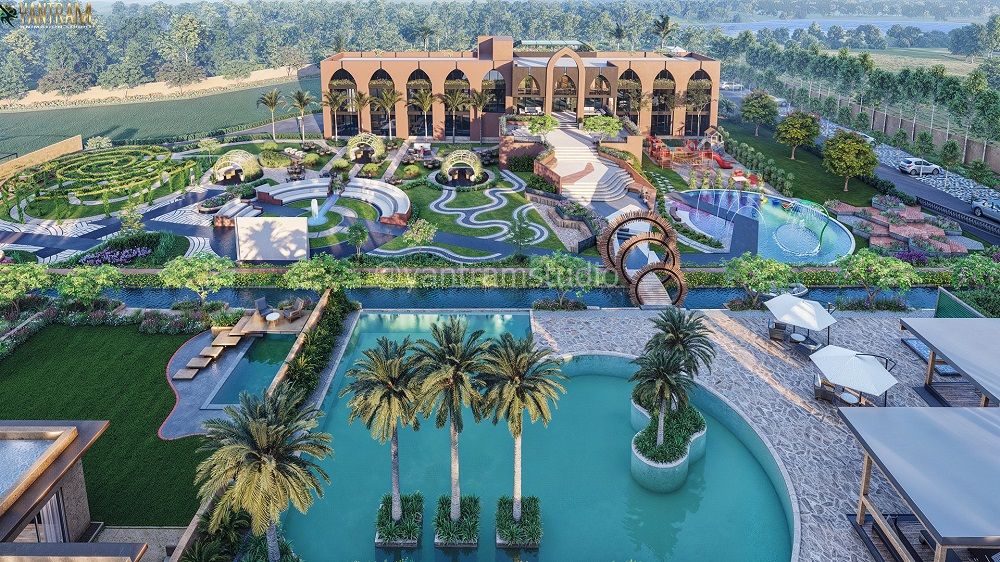 Yantram Studio specializes in creating captivating 3D architectural visualizations for resort landscapes and recreational facilities. Our renderings showcase the unique features and vibrant atmosphere of your outdoor spaces, from dynamic water play areas to serene garden designs, helping you present your vision with unparalleled clarity.