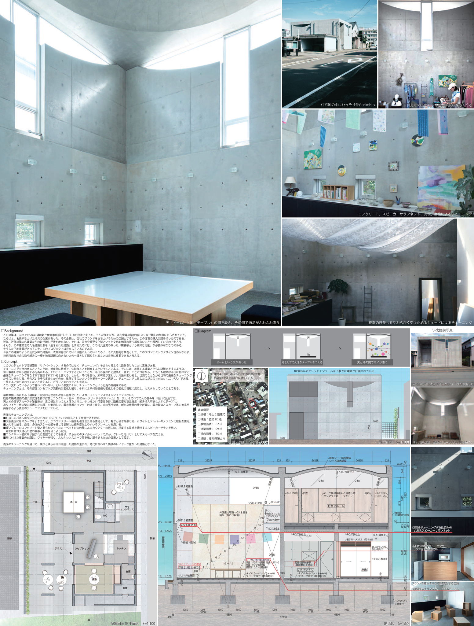 このプロジェクトでは建築を「リノベーション」するのではなく「チューニング」を合わせるように設計をしたことに意味がある。チューニングを合わせるということは、対象物に敏感で、些細なことを観察するということである。そこには、改修する建築とともに謎解きをするような、深く観察しながら設計する行為がある。そのチューニングするということが、時代が変われど建築を「継ぐ」ことにつながる。そもそも建築は時代に合わせて最適なチューニングをなされて設計されていると言える。しかし、時代を重ね、所有者が変わり、用途が変わると、当然のことながら当時の最適なチューニングからズレが生じる。そのズレをそのまま生かすのか、改修するのかという作業を一つ一つ選択し、チューニングし直したのがこのnimbus(ニンバス)である。一見すると何も変わってないと言えるし、ガラリと変わったとも言える。この「変わっているようで変わっていない」という感覚こそが、チューニングという行為の醍醐味である。チューニングとは、その都度コンセプトが流動的に変化し続け、それにより付加価値も変化しその変化に機敏に反応し、カスタムしていくことである。