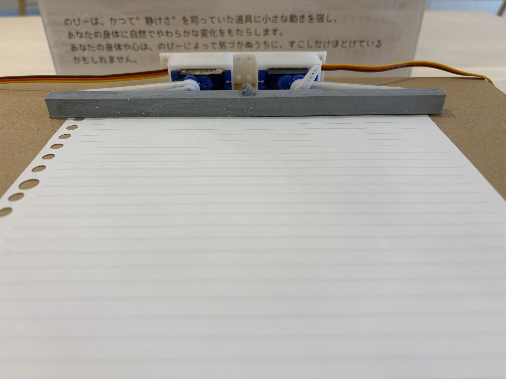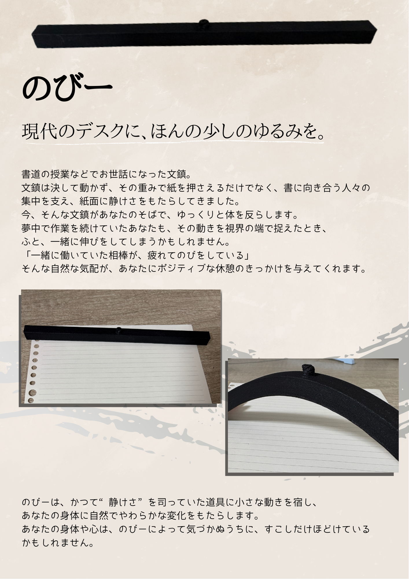『のびー』は、長時間のデスクワークに寄り添い、休憩を自然に促す“動く文鎮”です。