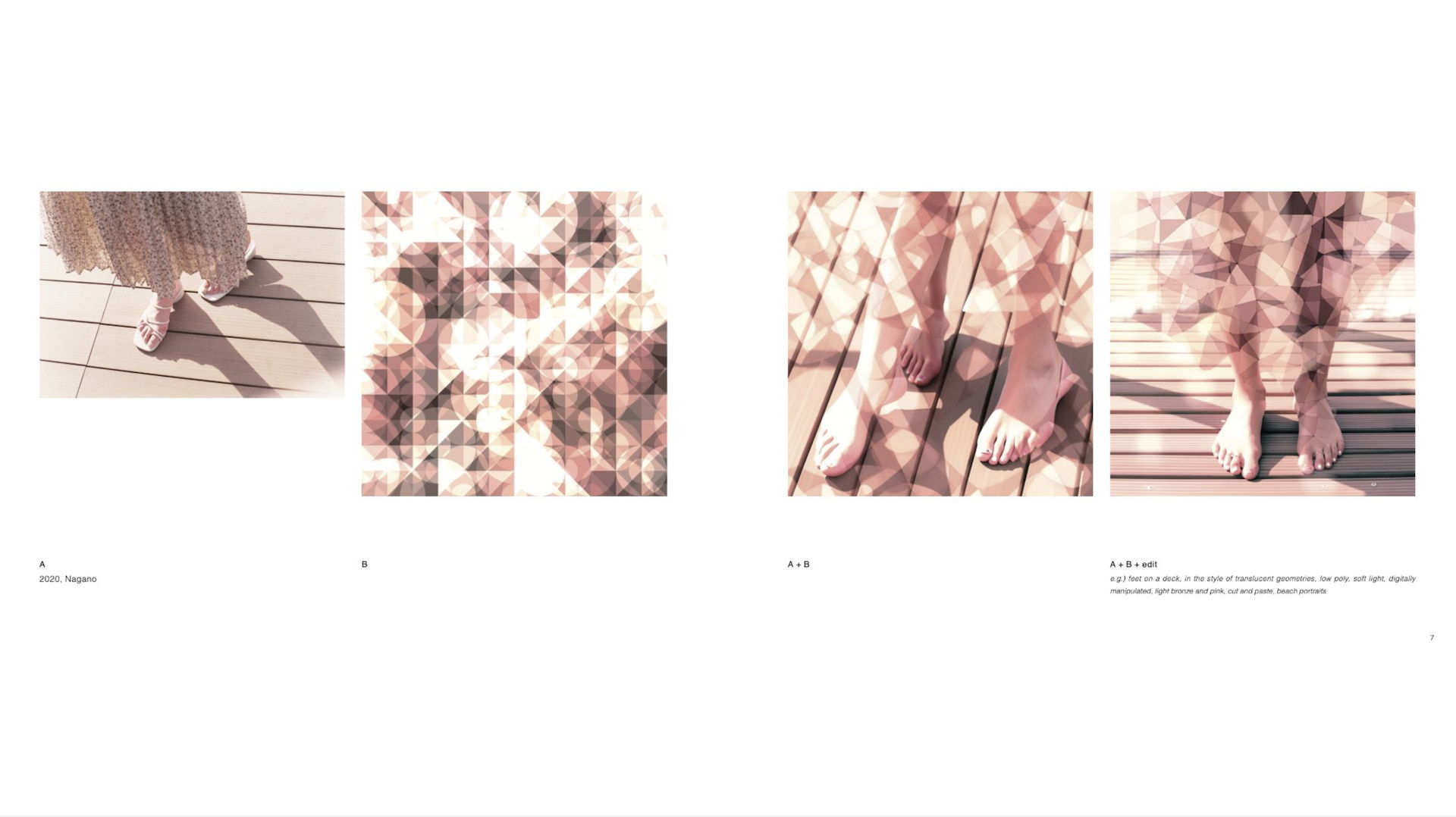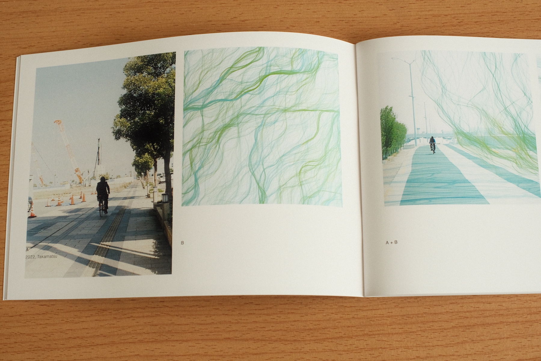 このZineには、筆者がフィルムカメラで撮影した写真と、プログラミングによるスケッチ、またそれらを画像生成AIを使って合成・改変したものが掲載されています。①フィルム写真、②p5.jsスケッチ、③blend画像、④更に数回生成を繰り返した画像、の4枚が並ぶ構成です。