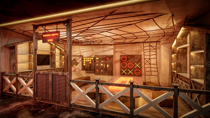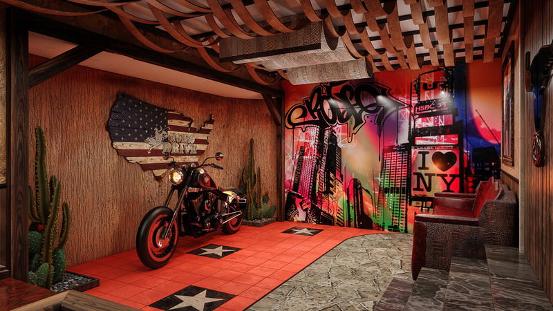 This striking 3D interior design rendering captures the bold, energetic spirit of New York through a carefully curated urban theme. Inspired by the city’s street culture, the space blends industrial textures, vibrant wall art, and iconic American elements to create a visually powerful environment. Graffiti-style murals, the “I ❤️ NY” signage, and cityscape graphics instantly set a metropolitan mood, while warm wood finishes and structured ceiling elements add depth and balance. The motorcycle display acts as a strong focal point, symbolizing freedom and individuality—core elements of New York’s identity. Thoughtful lighting enhances textures and highlights key design features, making the space feel immersive and dynamic. Ideal for lounges, themed cafes, hospitality spaces, or lifestyle interiors, this 3D visualization demonstrates how storytelling and design can work together. The rendering reflects how modern interior design in New York embraces creativity, character, and a fearless mix of art and architecture.