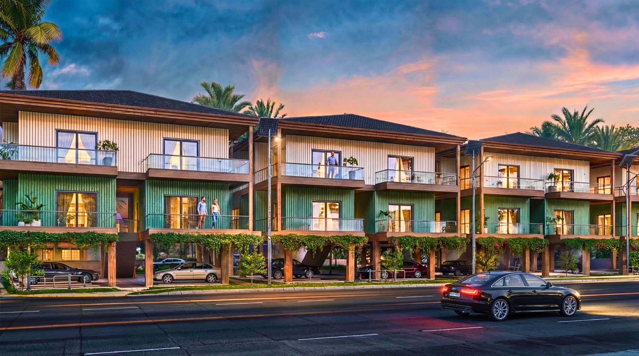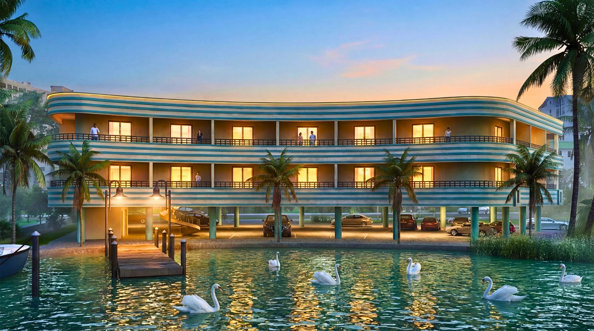 Through expert Landscape 3D rendering, we enhance the surrounding environment with realistic greenery, palm trees, walkways, waterfront reflections, and atmospheric sunset lighting — creating emotionally compelling visuals.