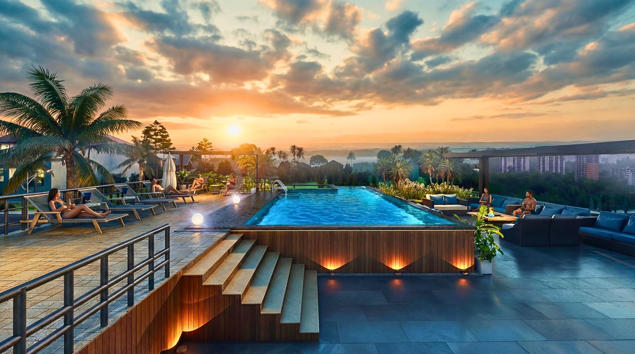 * Rooftop pool decks with sunset views