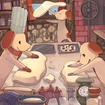 一番下のイヌは ピザ生地まわしが得意なんだって