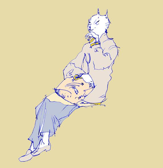 この時には、わりと上品な御夫人の他、乳母車で入ってきた母子、ニキビ面の少年、傲慢そうな中年男などを描いたが、みなその顔はモデルをヒントに猫の顔にした。