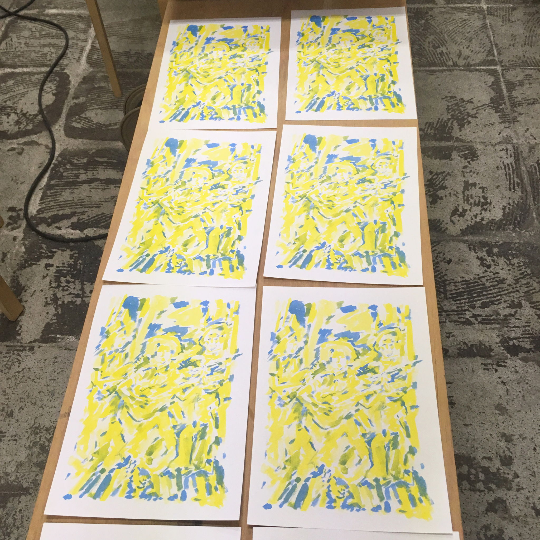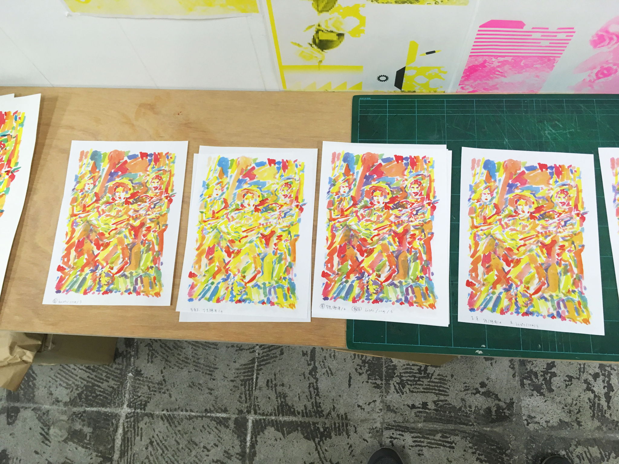 アクリル絵の具・カラーインクで描いた絵をphotoshopで3色に分解して原稿を作りました。