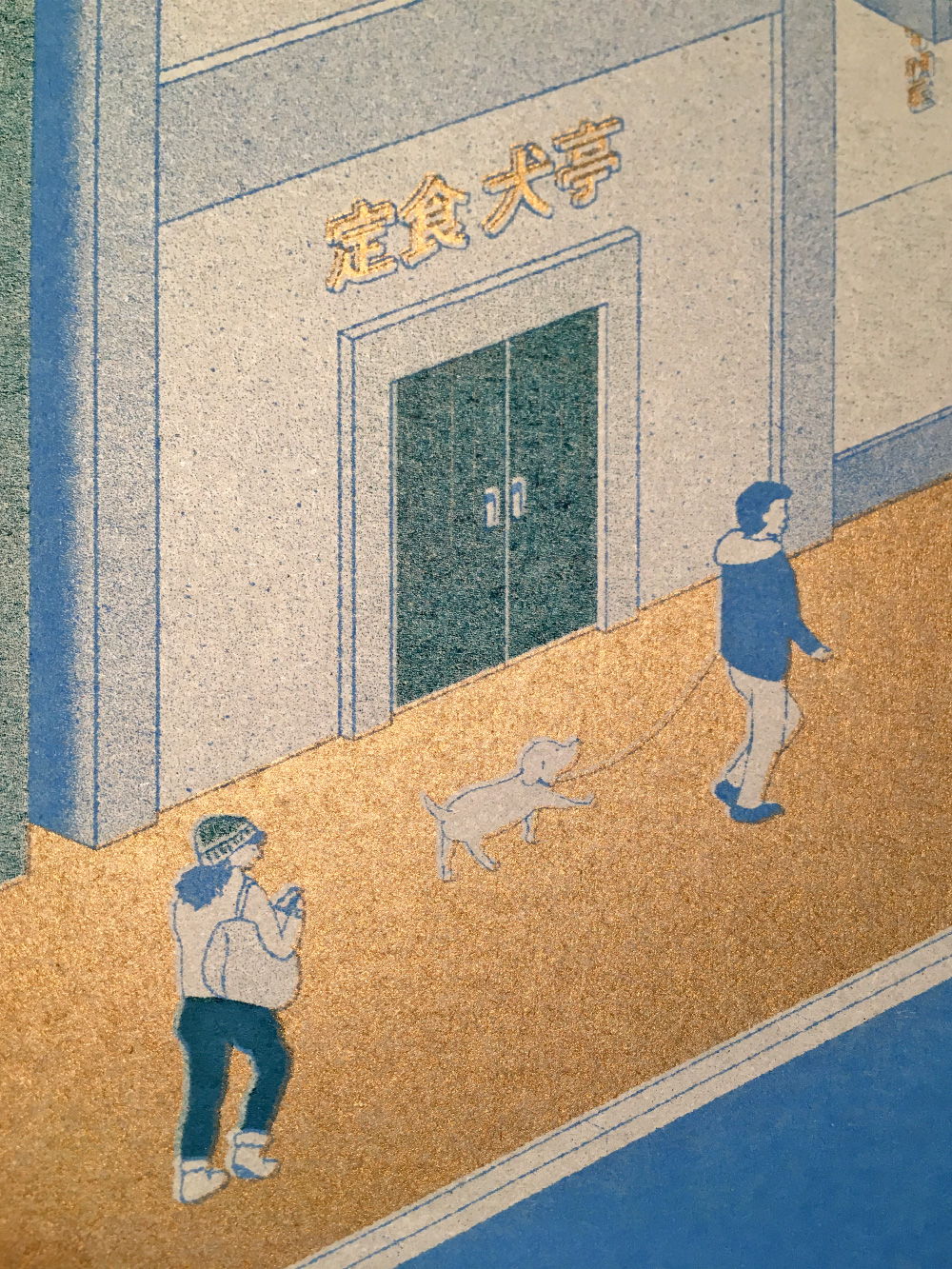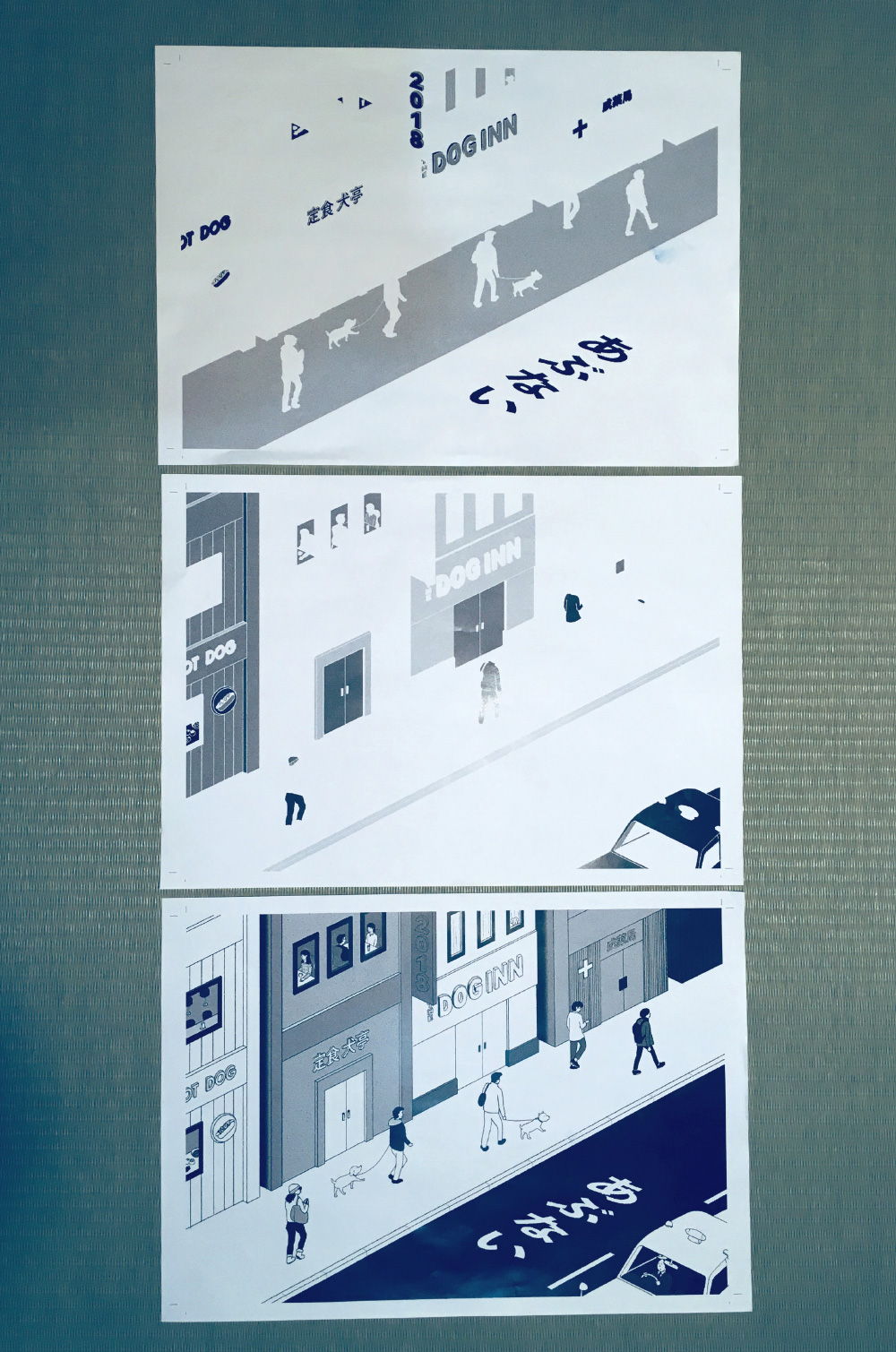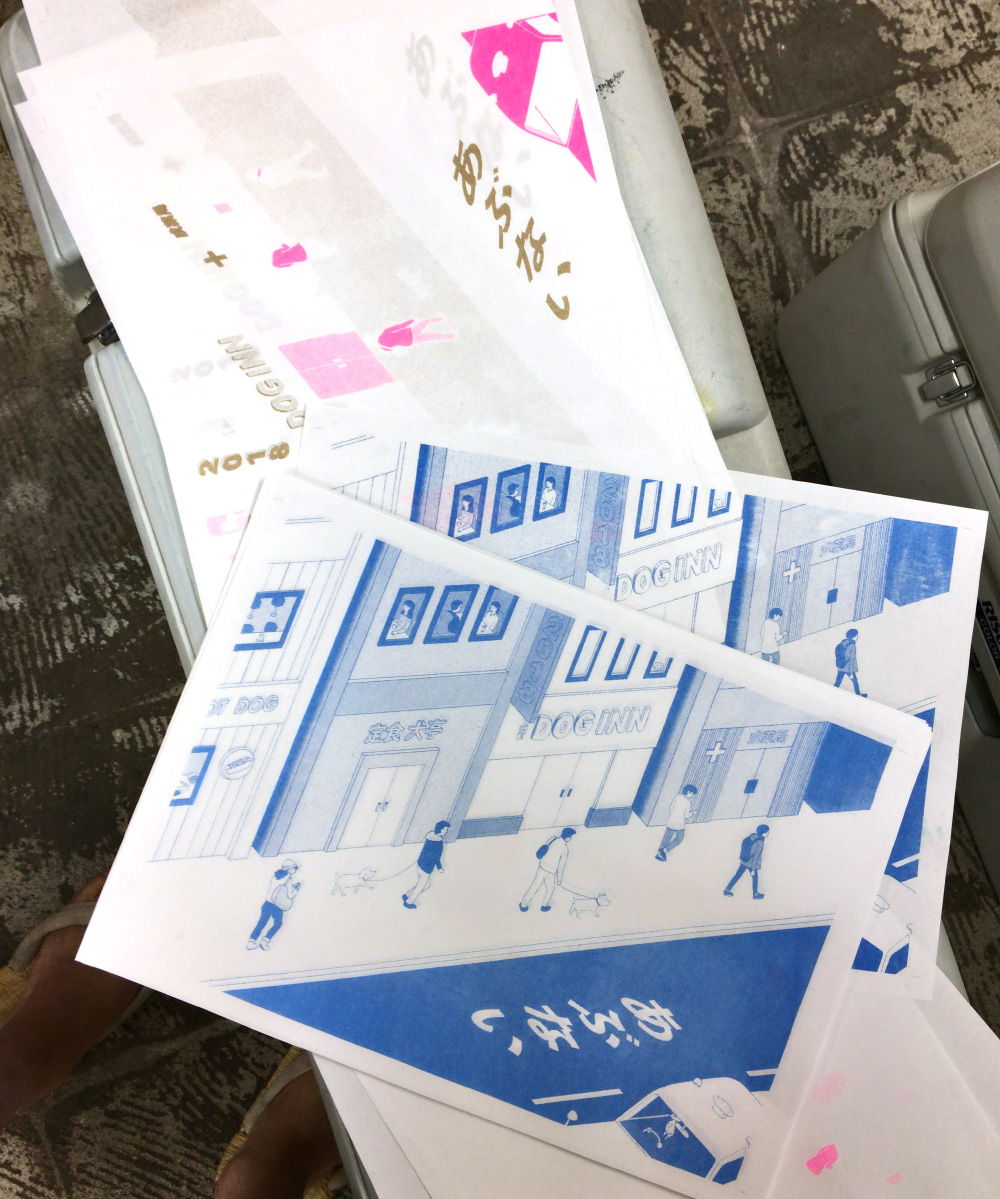 最初、蛍光ピンクで試しましたが、版下を濃いめに作ってしまって浮いた感じがしたので、渋い緑に変更しました。First, I tried to print with neon pink, but this pink was too strong for this print. I felt something wrong with it, so I changed it to teal green.