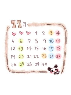 11月の待ち受けです。新キャラクタ「パンパカ」は、すでに描き方がわからなくなりました☆1ヶ月カレンダ付き。大きさは、240×320。