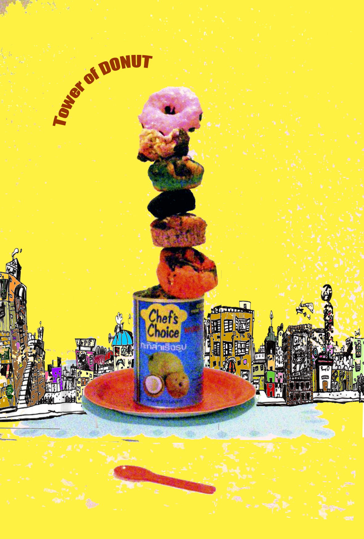 ドーナツ・マフィン・スコーンが積み重なってる【KiMo:ama】タワー!!-これ、ホンマに食べれますvv下にはウッキーたちの街≪とある街≫。街並みに1つでっかいタワーが建っている・・・・そんな感じ-ちなみにウッキーの住み家【アパートメント・ウッキーズ】も有ります デザイン・フェスタvol.27のブース宣伝用ポスターとしても使ったお気に入り